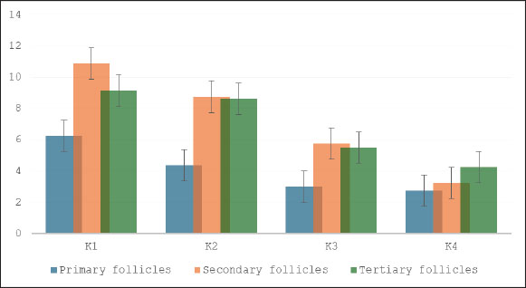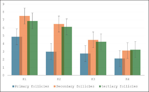 Fig. 9. Effect of S. lappa extract on the number of primary, secondary, and tertiary follicles. *p < 0.05. Mean ± SD. K-1 (control group), treatment group with 70% ethanol extract of S. lappa: doses K-2 (200 mg/kg), K-3 (400 mg/kg), and K-4 (600 mg/kg). Number of primary, secondary, and tertiary follicles in each group. Primary follicles: (K1) 2.88 ± 1.46; (K2) 5.63 ± 1.06; (K3) 5.88 ± 1.25; (K4) 8.63 ± 1.41. Secondary follicles: (K1) 2.25 ± 1.04; (K2) 3.25 ± 1.04; (K3) 3.63 ± 1.30; (K4) 5.13 ± 1.25. Tertiary follicles: (K1) 2.13 ± 1.13; (K2) 3.13 ± 1.13; (K3) 4.00 ± 1.07; (K4) 4.63 ± 1.19.