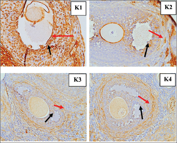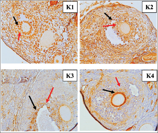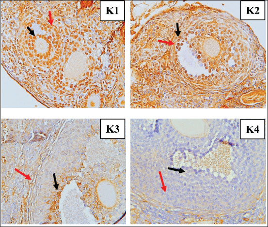 Figure 5 contrasts the TNF-α levels in GCs from the control group (K1) with those in the treatment groups receiving S. lappa 70% ethanol extract dosages of 200 (K2), 400 (K3), and 600 (K4) mg/kg. The primary follicles in the 600 mg/kg group (K4) exhibited reduced levels, and tertiary follicles (Fig. 6) displayed decreased levels at 200 mg/kg (K2) compared with the control group (K1). The secondary follicles at the 600 mg/kg dosage (K4) demonstrated reduced levels relative to the control group (K1).