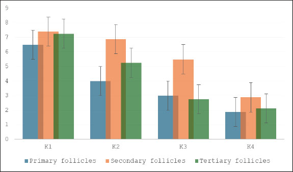 Fig. 3. Effect of S. lappa extract on FiSOP granulosa cells of primary, secondary, and tertiary follicles. *p < 0.05. Mean ± SD. K-1 (control group), treatment group with 70% ethanol extract of S. lappa: doses K-2 (200 mg/kg), K-3 (400 mg/kg), and K-4 (600 mg/kg). The number of primary, secondary, and tertiary follicles in each group (primary follicles): (K1) 6.25 ± 1.67; (K2) 4.38 ± 2.39; (K3) 3.00 ± 2.00; (K4) 2.75 ± 1.49. Secondary follicles: (K1) 10.88 ± 1.81; (K2) 8.75 ± 1.67; (K3) 5.75 ± 1.98; (K4) 3.25 ± 1.39. Tertiary follicles: (K1) 9.13 ± 1.81; (K2) 8.63 ± 1.69; (K3) 5.50 ± 1.31; (K4) 4.25 ± 1.04.