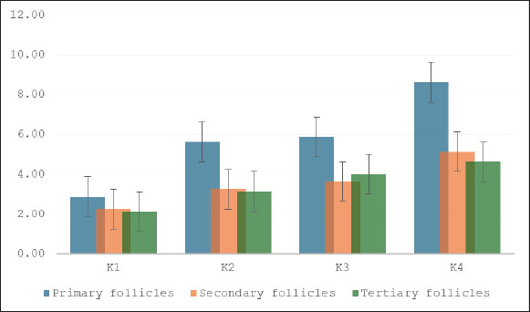 The number of primary, secondary, and tertiary follicles (Fig. 9) was higher in all groups that received S. lappa extract (K2, K3, and K4) than in the control group (K1). The treatment group with a dose of 600 mg/kg (K4) had the highest number of primary, secondary, and tertiary follicles compared with the treatment groups receiving doses of 200 (K2) and 400 (K3) mg/kg, as well as the control group (K1).