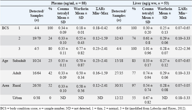 ABSTRACTBackground: Anticoagulant rodenticides (ARs) are widely used worldwide to control rodents. Currently, many countries are considering the use of ARs, which results in widespread accumulation and poisoning of nontarget animals. Nontarget pigeons (Columba livia) typically live near human communities and agricultural areas. These birds are at high risk of accidental daily exposure to ARs. Aim: This study aimed to evaluate ARs in the liver and plasma of pigeons living in rural and urban areas of Thailand. Methods: Bird samples were characterized by sampling location, age, body weight (BW), and body condition score. Liver and plasma samples were extracted using liquid–liquid extraction with diethyl ether and analyzed for coumatetralyl and warfarin by liquid chromatography–mass spectrometry. Results: Coumatetralyl and warfarin were detected in pigeons from both rural and urban areas. Both subadult and adult birds showed the presence of these two compounds, which were mainly detected in rural areas. The increase in BW was compared with the accumulation of coumatetralyl and warfarin, and a significant difference was observed. In addition, the concentration of coumatetralyl was significantly higher in the liver than in the plasma. The plasma concentrations of coumatetralyl and warfarin were 0.19–0.50 and 0.12–2.41 ng/ml, respectively. In the liver, coumatetralyl levels were higher than those of warfarin, with concentrations ranging from 0.07- to 3.33-ng/g wet weight and from 0.12- to 0.50-ng/g wet weight. Conclusion: AR use in human settlements and agricultural areas poses a high risk of accumulation in nontarget animals, such as pigeons. The findings of this study indicate coumatetralyl and warfarin in various concentrations in pigeon hepatic and plasma samples. Keywords: Coumatetralyl, Pigeons, Rural, Urban, Warfarin. IntroductionAnticoagulant rodenticides (ARs) are widely used worldwide to control rodent populations in both agricultural and urban areas. These chemicals include warfarin and its derivatives, which are more toxic and have long-lasting effects on animals and humans. Although ARs are effective in targeting rodents, their use poses significant risks to nontarget species, such as humans, pets, and wildlife. In ecosystems, the continued use of ARs can lead to secondary poisoning, where nontarget animals are exposed to these toxicants through contaminated prey or environmental residues (Erickson and Urban, 2004; Bradbury, 2008; Thomas et al., 2011; Nakayama et al., 2019). Different AR classes are regulated for various applications in each country. In California, only first-generation ARs (FGARs) are approved for field use, whereas second-generation ARs (SGARs) are available to human communities, structural pest control operators, and others for controlling commensal rodents (Martínez-Padilla et al., 2017). The Ministry of Public Health of Thailand has established criteria for the prevention and control of insects and disease-carrying animals that pose health hazards, recommending the use of both biological and chemical methods, including ARs (Sapbamrer et al., 2023). The widespread use of ARs has resulted in significant poisoning of nontarget animals, with increasing toxicity and accumulation reported in wildlife worldwide. This is primarily due to the death of rodents poisoned by rodenticides, which are then consumed by predators such as snakes, carnivorous mammals, and predatory birds. These predators are at high risk of accumulating ARs in their bodies, which may lead to toxicity and mortality. For instance, research conducted from 1998 to 2015 found that over 2,500 predatory birds had accumulated ARs, particularly in the liver and kidney (Rattner et al., 2014). Several bird species, especially predatory birds, have been reported to be affected by ARs, including the great horned owl, barn owls, and barred owls in Canada (Albert et al., 2010), the common buzzard and peregrine falcon in Scotland (George et al., 2024), the golden eagle and eagle owl in Norway (Langford et al., 2013), Bonelli’s eagle in Spain (Vicedo et al., 2024), predatory and scavenging birds in France (Fourel et al., 2024), and native birds in New Zealand (Hoare and Hare, 2006). Recently, not only predatory birds, insectivores, reptiles, and carnivores have been reported in various European countries such as Australia, Italy, Germany, Slovenia, and the United Kingdom (Dowding et al., 2010; Lettoof et al., 2020; Cerkvenik-Flajs et al., 2024; Musto et al., 2024; Regnery et al., 2024). Furthermore, AR poisoning has been reported less frequently in domestic and water birds, such as the gray heron, waterfowl, pigeons, and partridges (Sarabia et al., 2008; Guitart et al., 2010). The population of pigeons in Thailand is increasing, and they are commonly found in both urban and rural areas. Their behavior and habitats are closely associated with human communities and agricultural areas. Pigeons often feed on the ground, and as a result, they may ingest various contaminants, including pesticides such as ARs (Katevorn et al., 2020). Pigeons living together with feed behavior are a high risk to contaminant ARs, which might be a one biomonitoring as nontarget species. In addition, data on AR toxicity in pigeons in Thailand are still limited. Agriculture is a major sector in Thailand, a leading exporter of rice, rubber, and cassava. Pesticides, including rodenticides, are widely used in agricultural areas. Over the period from 2012 to 2021, the trend of pesticide imports into Thailand has shown a gradual increase from 2012 to 2021 (Sapbamrer et al., 2023). Herbicides, fungicides, and insecticides are the top three pesticides used for agricultural purposes in Thailand. According to the Office of Agricultural Regulation, rodenticides rank among the top 10 products (Sapbamrer et al., 2023). FGARs, SGARs, and non-AR products are commonly described as baits. The chemicals most frequently found include coumatetralyl 