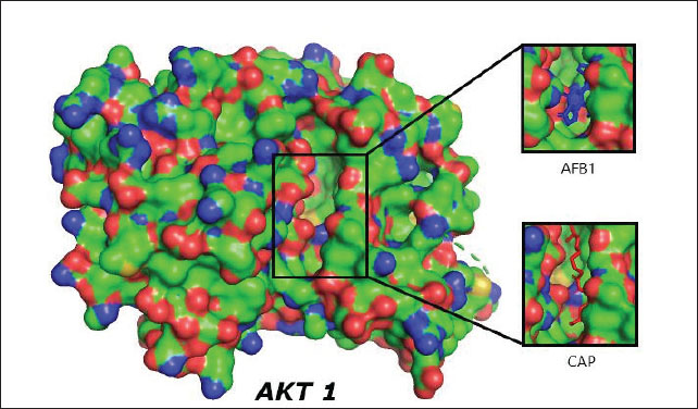 Fig. 1. Visualization of the interaction of the test ligands CAP (marked in red and Aflatoxin (AFB1) (intervening) marked in blue) with the target protein AKT1, both binding together at the same binding site/cavity.