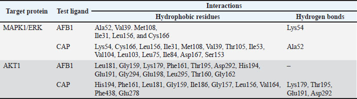 Proteins involved in the apoptotic pathway of cells caused by aflatoxin intoxication are MAPK1 in the MAPK1 signaling pathway and AKT1 in the PI3K/Akt signaling pathway. Aftoxin induces the formation of reactive oxygen species (ROS) and DNA damage in hepatocytes (Zhang et al., 2023). Molecular docking was performed on MAPK1 (ERK) and Akt1 proteins using the Autodock Vina 4.0 program and the CAP and Aflatoxin (AFB1) test ligands as intervening (control variables). The results of molecular docking are Gibbs free energy (ΔG) and virtual 3D visualization results. After performing molecular docking, the process of determining the active side of the protein and the amino acids that will bind to the test ligand (residue) is visualized using Ligplot+ and PyMOL. The quality of the molecular docking test results can be determined by analyzing the binding energy between the target protein and the test ligand using the Gibbs free energy (ΔG) and by analyzing the binding site to determine the interaction between the target protein and the test ligand. The value of ΔG comes from the scoring function with the following equation: S1 (ΔG)=g (c1 − cintra1)=g (cinter1) Where g is a nonlinear function and c is the conformation or interaction caused by intramolecular or intermolecular hydrophobic reactions or hydrogen bonds. If ΔG is negative, the reaction will occur spontaneously, and the affinity of the test ligand to the target protein will be higher (Trott and Olson, 2010). Validation of the molecular docking is that the root mean square deviation (RMSD) value must be less than 2 Ǻ because the smaller the RMSD value, the closer it is to the original binding position of the test ligand (binding pose) with the simulated target protein. If it exceeds 2 Ǻ, the binding pose gets worse, rendering the results invalid. After molecular docking, it was found that CAP binds to AKT1 with a ΔG of −6.5 Kcal/mol, with a ΔG value for Aflatoxin (AFB1) of −7.0 Kcal/mol, with visualization of the binding and binding site in Figure 1. In the test with the MAPK1/ERK target protein (Fig. 2), the ΔG for CAP was −5.5 Kcal/mol and for AFB1 was −5.7 Kcal/mol. All of these ΔGs are very negative, so the reaction will occur spontaneously and cause high affinity for both AFB1 and CAP on the MAPK1/ERK and Akt target proteins, and all RMSD values for the four tests are below <2 Ǻ (Table 2).