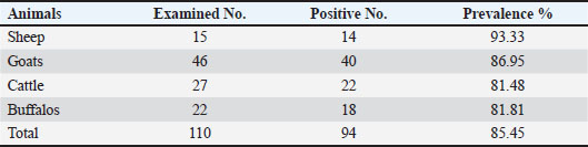 ABSTRACTBackground: Toxoplasma gondii is a zoonotic disease that is widespread worldwide and considered one of the most common tropical diseases in some countries. Accurate serological distribution and risk factors for animal and human parasite infection in Baghdad city/Iraq have not been adequately studied despite the importance of such studies. Aim: This study aimed to identify the Toxoplasma hemoparasite and potential risk factors of Toxoplasma parasite infection in sheep, goats, cattle, and buffaloes in the Abu Guraib area west of Baghdad city using enzyme-linked immunosorbent assay (ELISA). Methods: In total, 110 serum samples were randomly collected from 15 sheep, 46 goats, 27 cattle, and 22 buffalos of different ages during December 1, 2023 to December 1, 2024 in the Abu Guraib area west of Baghdad city. For identification using an indirect ELISA test. Results: The results presented 94 (85.45%) positive serum samples for Toxoplasma gondii in all animals included in this study were in sheep 15 (93.33%), goats 46 (86.95%), cattle 27 (81.48%), and buffalos 22 (81.18%). The highest prevalence rate was observed in sheep, and there was no significant difference between different animals, whereas there was high significant difference at (p ≤ 0.05) between females and males in all animals. Conclusion: This study concluded that the infection rate was high with T. gondii in sheep, goats, cattle, and buffaloes, indicating contamination with the parasite in livestock in the Abu Guraib area west of Baghdad city and may be a risk factor for infection in humans by consumption of meat from these animals. Key words: Toxoplasma gondii, ELISA, Ruminant, Prevalence, Iraq. IntroductionToxoplasmosis occurs in flocks and affects many countries. It is given as one of the main reasons for abortion in many countries (Blewett and Watson, 1984; Dubey and Beattie, 1988; Dubey, 2004). It is an important economic disease that affects herds, mainly sheep and goats, due to Toxoplasma gondii (Mohamad et al., 2010). Toxoplasma infection causes fetal death, resorption, embalming, reproductive failure, newborn death, or birth of weakly and incapable fetuses (Amina et al., 2015; Al-Abodi, 2019), and huge economic losses to the industry of ovine and caprine and was considered one of the most important reasons for abortion of goats and sheep (Buxton et al., 2007). According to Khan et al. (2017), nearly all animal species, including humans, are infected with toxoplasmosis due to its extensive global presence. The severity and progression of an infection are largely determined by the immune system’s strength and response in the affected individual (Muhsin et al., 2013; Al-Abodi, 2017). Toxoplasma gondii is a crescent-shaped cell (~2 μm wide, 5 μm long) with sharp anterior and rounded posterior ends. The cytoskeleton supports structure, motility, and cell invasion, housing organelles like the Golgi, ribosomes, mitochondria, apicoplast, ER, and a plastid-like structure. In warm-blooded animals, T. gondii multiplies asexually, whereas sexual reproduction is confined to felines, which serve as the parasite’s definitive hosts(Weiss and Dubey, 2009; Mercier et al., 2011; Hill and Dubey, 2013; Majeed and Abbas, 2018). Toxoplasmosis is a widespread parasitic infection affecting both humans and livestock, significantly affecting public health and animal productivity (Dubey, 2010). A study by Madi and Al-Samarai (2022) confirmed the presence of toxoplasmosis in milk from Iraqi local and Shami goats, while also examining how infection and various factors impact milk composition in these breeds. It poses a public health concern due to its transmission through consumption of undercooked meat containing tissue cysts, contaminated food or water with oocysts, or accidental ingestion of sporulated oocysts from soil (Alvarado-Esquivel et al., 2011). Issa and Omer (2011) in the northern Iraqi city of Dohuk revealed that the prevalence of T. gondii antibodies was 95.65% and 27.17% using LAT and ELISA, respectively. In ewes, T. gondii antibodies were detected by LAT in 97.4% of samples and ELISA in 33% of samples. In does, 94.33% and 22.64% of samples were positive by the LAT and ELISA, respectively. Toxoplasma gondii, an intracellular parasite causing significant disease in humans and animals, has unknown genetic diversity in Iraqi sheep.in study investigated T. gondii genotypes in sheep from Wasit province, Iraq, by analyzing 315 samples (300 blood and 15 placenta tissue) from aborted ewes. Samples were tested using LAT serology and RT-PCR (B1 gene amplification), confirming 10 T. gondii DNA-positive cases. Genotyping via nested PCR-RFLP of the SAG2 gene revealed that 60% were Type II, 30% Type III, and 10% Type I, with Type II being the dominant genotype in the region (Aaiz, 2016). Madi et al. (2022) found that sequencing of the SAG3 gene in T. gondii isolates from goats and humans revealed high similarity, ranging from 98.65% to 99.90%, specifically for genotypes I and III. In Baghdad, Iraq, study by Rifaat and Jawdat (1998) utilized two diagnostic methods—the complement fixation test and the direct fluorescent antibody test—to detect T. gondii antibodies in serum samples from 143 sheep and 44 goats. CFT identified complement-fixing antibodies in 26.2% of sheep sera (38/143) and 54.5% of goat sera (24/44), while FAT detected antibodies in 18.2% of sheep sera (26/143). Also, study conducted in Erbil city, Iraq, seroprevalence of T. gondii in sheep (25.4%) and goats (28.4%) using latex agglutination, MAT and ELISA confirmed similar positivity rates in latex-positive samples. No significant difference between ELISA and MAT results (Kader and Al-Khayat, 2013). Materials and MethodsCollection of samplesA total of 110 blood samples were randomly collected from animals, comprising 15 sheep, 46 goats, 27 cattle, and 22 buffaloes, specifically targeting females with a history of abortion. These animals, ranging in age, were gathered f