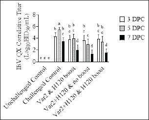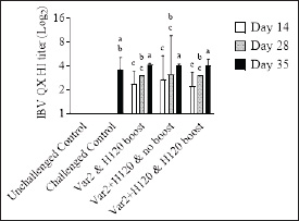 Fig. 2. IBV QX HI titers. On D14, D28, and D35, 10 birds from each group were bled. Serum samples were analyzed by HI assay using an IBV QX-specific antigen. Bars represent the mean ± SD (n=10). Two-way ANOVA followed by Šídák multiple comparisons test. Bars not connected by the same letter are significantly different (p < 0.05).