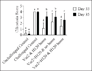 Fig. 4. Ciliostasis scores. On D33 and D35, seven birds from each group were euthanized and 10 tracheal explant sections were scored for ciliostasis. Bars represent the mean ± SD (n=70). Two-way ANOVA followed by Šídák multiple comparisons test. Bars not connected by the same letter are significantly different (p < 0.05).