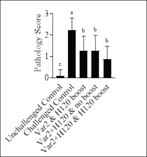 Fig. 6. Tracheal histopathology scores. On D35, tracheal samples from three birds from each group were analyzed by a pathologist according to 6-category scoring criteria on a scale of 0–3. Bars represent the mean ± SD (n=33). One-way ANOVA followed by Tukey’s multiple comparisons test. Bars not connected by the same letter are significantly different (p < 0.05). Scoring criteria and scale are described in Table 3. Table 4. Histopathological analysis of the kidneys. On D35, kidney samples from three birds from each group were analyzed by a pathologist.