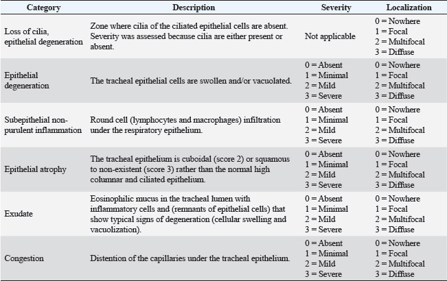 Challenge virus strainAll birds, except the unchallenged control group, were challenged on D28 with the IBV QX strain, GI-19 genotype (Poulpharm BV, Izegem, Germany, 2019 isolate; Table 1). Each bird received a dose of 0.1 ml containing 104 EID50 of the challenge virus via eye-drop administration. Sampling and measurementsClinical signsGeneral health observations were conducted and recorded by an experienced animal caretaker at least once daily, starting from hatching and continuing until the conclusion of the study. Specific clinical observations for signs associated with IBV were recorded daily D28–D35. The scoring system for clinical signs was previously described (Sultan et al., 2019; Kilany et al., 2025). Serological responses against IBVOn D0, four blood samples of at least 1 ml were collected from ten, unenrolled hatchmates. These samples were subjected to serological analysis using the Enzyme-Linked Immunosorbent Assay (ELISA) method (Biocheck BV, The Netherlands, Cat. CK119IBV) to confirm that the flock of SPF chickens was free from antibodies against IBV. At days 14, 28, and 35, blood samples were collected via wing vein from ten animals per group to determine the serological responses to the IBV QX challenge. Serum was separated by centrifugation and analyzed by both ELISA and HI assay. IBV antibody titers measured by ELISA below 833 were considered negative. IBV QX antigen (Poulpharm, Izegem, Germany) was used in the HI assay to assess the presence of inhibitory antibodies against IBV. All HI titers were expressed as the log2 of the reciprocal of the highest serum dilution showing complete HI. Viral shedding after challengeOn D31, D33, and D35, tracheal swabs were taken from ten birds per group (the same ten birds that were used for blood sampling throughout the study) and stored in phosphate-buffered saline. Samples were processed for quantitative real-time polymerase chain reaction (RT-qPCR) with a commercial kit specific for the IBV QX (IBV QX, Cat. 31095, Kylt, Höltinghausen, Germany) according to the manufacturer’s instructions. Simultaneously, 10-fold dilutions of the vaccine were analyzed with the same kit, and the Ct values from the qPCR analysis were correlated with the known titer (EID50) of the diluted vaccine samples. The qPCR data were represented as an IBV QX titer (Log10EID50/ml) based on this correlation with live infectious virus. Ciliostasis scoringOn day 33 and day 35, seven birds from each group were humanely euthanized by intravenous injection of an overdose of a 300 mg/ml solution of pentobarbital sodium (Release®). Separate birds were used for ciliostasis scoring from those used for tracheal swabbing. The tracheas were collected and placed in individual 15 ml sterile conical tubes containing 10 ml pre-warmed minimum essential medium (MEM) Hanks’ salt. Tracheal samples were transferred to sterile Petri dishes containing 5 ml of MEM Hanks’ salt, and any excessive fat and connective tissue were removed using a scalpel. Each trachea explant was flushed twice with MEM Hanks’ salt. Ten thin transverse tracheal sections were cut using a scalpel, with three sections obtained from the upper, four from the middle, and three from the lower part of the trachea. These sections were observed under a light microscope at 10× and 100× magnification within 2 hours of sampling to assess ciliary activity. The activity of the cilia in each tracheal section was scored for ciliary movement (Table 2). The scoring criteria for determining normal ciliary activity were based on the European Pharmacopoeia monograph 07/2021:0442, Avian IB vaccine (live). Specifically, ciliary activity in a given tracheal section was considered normal if at least 50% of the internal ring exhibited vigorous ciliary activity, in other words when the ring received a score of two or less. To be deemed normal, a bird needed to have a minimum of nine out of ten rings showing normal ciliary activity. To calculate the ciliostasis score for each bird, the scores for all 10 tracheal sections were summed, and the mean score per tracheal ring was evaluated for each treatment group. Table 2. Ciliostasis scoring for tracheal sections.