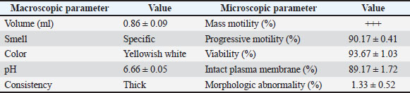 ABSTRACTBackground: Artificial insemination in sheep is one of the important reproductive technologies that accelerate the increase in the population of Sapudi sheep. The success of fertilization is higher with the addition of oxytocin in semen than with exogenous oxytocin administration. The semen diluents used were milk and egg yolk citrate. Aim: This study aimed to determine the effect of oxytocin inclusion in extender on viability, motility, plasma membrane integrity, malondialdehyde (MDA) levels, and catalase levels in Sapudi sheep semen stored at 5°C. Methods: Semen was collected with an artificial vagina and examined macroscopically and microscopically. Each ejaculate was divided into four parts according to the treatment group. The control group (T0) consisted of fresh semen diluted in a skim milk–egg yolk–citrate extender without oxytocin addition. The treatment groups received the same extender supplemented with oxytocin at different concentrations: T1 with 5 IU/100 ml, T2 with 10 IU/100 ml, and T3 with 15 IU/100 ml of extender. All treatments were stored at 5°C and evaluated daily for 5 days. Results: Group T2 had the highest viability, motility, intact plasma membrane, and catalase enzyme levels (p < 0.05) and the lowest MDA levels (p < 0.05). In group T3, the viability, motility, intact plasma membrane, and catalase enzyme levels decreased (p < 0.05), and the MDA levels increased (p < 0.05) compared with the dose in group T2. Conclusion: This study indicated that the inclusion of 10 IU/100 ml of oxytocin in skim milk–egg yolk–citrate extender can maintain the quality of Sapudi ram semen with a motility of more than 40% after 5 days of refrigerated storage. Keywords: Extenders, Catalase, Undernutrition, Motility, Viability. IntroductionIncreasing the population of Sapudi sheep is essential for supporting the Free Nutritional Meal Program in Indonesia (Nilamcaya et al., 2024). Sapudi sheep have good meat and milk quality and high nutritional value (Khasanah et al., 2025). Increasing sheep populations can provide a source of quality animal protein for the community, especially for children and vulnerable groups who need optimal nutritional intake for growth and development (Khasanah et al., 2025). The Free Nutritional Meal Program aims to reduce stunting and malnutrition among children (Sarjito, 2024). One strategy for ensuring the availability of nutritious meat as part of a balanced diet is to utilize Sapudi sheep. In addition, Sapudi sheep have good adaptability to the local environment, so they can be raised in various regions, especially in rural areas that have the potential for livestock development (Mudawamah et al., 2022). Increasing the population of Sapudi sheep offers not only nutritional benefits but also significant economic benefits for livestock communities (Mirella et al., 2022). Enhancing sheep numbers and quality enables farmers to generate additional income from meat and milk production, thereby supporting household welfare. This initiative contributes to food security while simultaneously strengthening the local economy (Mudawamah et al., 2022). Strong collaboration between the government, farmers, and the wider community is essential to ensure the effective and sustainable implementation of the Free Nutritious Meal Program (Pambudi, 2025). Artificial insemination (AI) in sheep is one of the important reproductive technologies that accelerate the increase in the population of Sapudi sheep (Madrigali et al., 2021). With AI, males with superior genetics can produce a much higher number of offspring. However, an important reason why AI is not widely used in sheep today is the high cost of AI and the low quality of sheep spermatozoa after the storage process (Gibbons et al., 2019). Fertilization success is higher with the addition of oxytocin in semen than with exogenous oxytocin (Kandemir, 2023). Oxytocin administration can increase contractions of the female reproductive tract, but the dose must be right so that it can increase the pregnancy rate (Viudes-de-Castro et al., 2009). The sheep spermatozoa are more vulnerable than those of other species. This means that sheep sperm cells (spermatozoa) are more sensitive or fragile compared with the sperm of other animal species, such as cattle, goats, or pigs, which is primarily attributed to their plasma membrane composition (Yánez-Ortiz et al., 2022). Sheep sperm membranes contain a higher proportion of PUFAs and a lower cholesterol-to-phospholipid ratio, resulting in increased membrane fluidity but reduced structural stability during cooling, freezing, or thawing. This lipid composition makes the membrane more susceptible to cold shock and oxidative stress, thereby lowering their resilience compared to species with higher cholesterol content in sperm membranes (Castro et al., 2025). Dilution of sheep semen is needed to increase the dose and extend the life span of the sheep (Zhang et al., 2024). Live spermatozoa do not necessarily show progressive movement. The success of artificial insemination also depends on the percentage of live and movement of spermatozoa (Dcunha et al., 2022). The semen extenders used were milk and egg yolk citrate. Milk contains carbohydrates, whereas egg yolk contains lecithin, which protects spermatozoa from cold shock (Bustani and Baiee, 2021). Studies on the use of milk and egg yolk citrate extenders with the addition of oxytocin have never been conducted on semen from Sapudi sheep. Therefore, this study aimed to detect the role of oxytocin in extenders on viability, motility, plasma membrane integrity, malondialdehyde levels, and post-thawing catalase levels. Materials and MethodsResearch designThis study was conducted in June–November 2024 at the experimental animal cage of the Faculty of Veterinary Medicine, Airlangga University, Mulyorejo, Surabaya, Indonesia, in June−November 2024. Six male Sapudi sheep aged 21.55 ± 4.32 months with a body weight of 47.23 ± 6.51