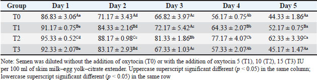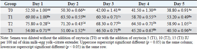 Table 3. Motility (%) of Sapudi ram spermatozoa in skim milk–egg yolk–citrate extender without or with the addition of several doses of oxytocin at 5°C for 5 days.