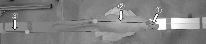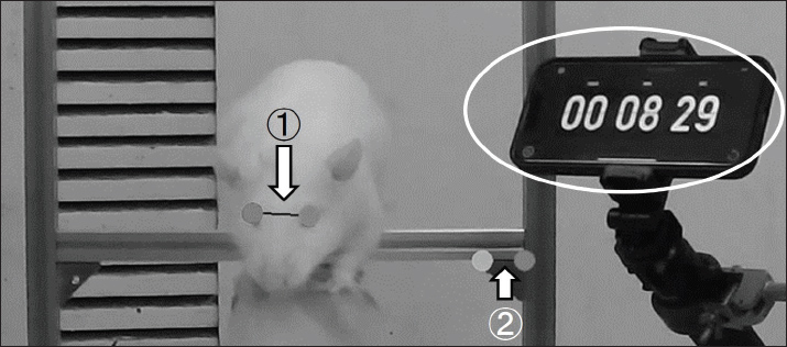 Fig. 1. Frontal image. The head inclination angle was estimated from the line connecting both eyes (①) and the line connecting two points on the beam visible in the horizontal plane of the screen (②). The travel time within the measurement section in the front image was identified by capturing the same clock in the front image as that in the right-side image. Lateral images (Fig. 2A)From the left lateral view, the observation points included the nose, ear canal, forelimb heel, and the two ends of a 190-mm tape affixed to the beam. The head inclination angle was estimated from the line connecting the nose and ear canal (Fig. 2A①) and the line connecting the two points on the tape (Fig. 2A②). In addition, the stride length was calculated using the position of the forelimb heel (Fig. 2B③). The coordinates obtained from the DLC were calibrated based on the 190-mm tape to convert them into millimeters (Fig. 2B). The mean, maximum, and minimum head inclination angles and the average stride length over two steps were analyzed.