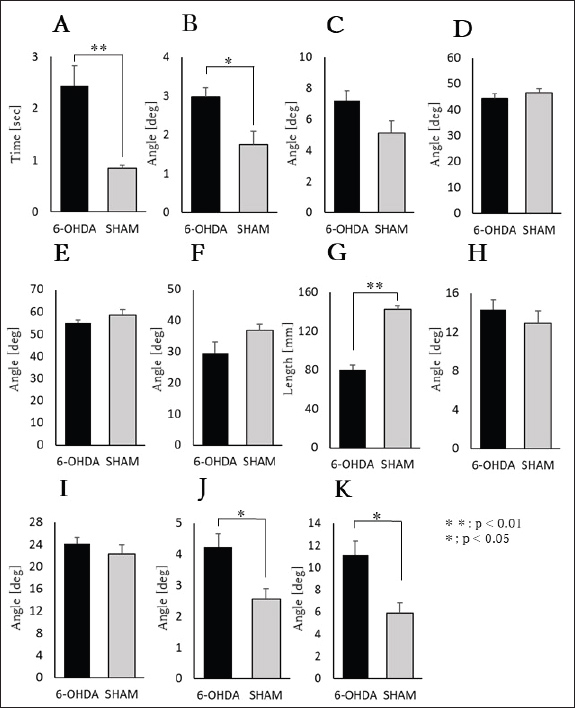 Fig. 4. Summary of the Results. A: Time to task completion. B: Mean front image head inclination angle value. C: Maximum front image head inclination angle value. D: Mean lateral image head inclination angle value. E: Maximum lateral image head inclination angle value. F: Minimum lateral image head inclination angle value. G: Stride length. H: Mean top image head inclination angle value. I: Maximum inclination angle of the top image head. J: Mean top image trunk inclination angle value. K: Maximum top image trunk inclination angle value. Data are expressed as mean ± SEM. Deg: degree. Image analysis(1) Frontal image (head inclination angle) • Mean angle: The mean head inclination angle was significantly greater in the 6-OHDA group (2.97° ± 0.24°) than in the SHAM group (1.75° ± 0.35°) (p < 0.05: unpaired t-test) (Fig. 4B). • Maximum angle: The maximum head inclination angle was 7.21° ± 0.64° in the 6-OHDA group and 5.13° ± 0.76° in the SHAM group, with no significant difference between the groups (unpaired t-test) (Fig. 4C). (2) Lateral image • Head inclination angle: The mean head inclination angle was 44.26° ± 1.77° in the 6-OHDA group and 46.47° ± 1.73° in the SHAM group, with no significant difference between the groups (unpaired t-test) (Fig. 4D). The maximum head inclination angle was 54.95° ± 1.41° in the 6-OHDA group and 58.47° ± 2.56° in the SHAM group, with no significant difference between the groups (unpaired t-test) (Fig. 4E). The minimum head inclination angle was 29.52° ± 3.71° in the 6-OHDA group and 36.93° ± 1.84° in the SHAM group, with no significant difference observed (Welch’s test) (Fig. 4F). • Stride length: The stride length was significantly shorter in the 6-OHDA group (79.90 ± 5.01 mm) than in the SHAM group (142.23 ± 4.13 mm) (p < 0.01: unpaired t-test; Fig. 4G). (3) Top image • Head inclination angle: The mean head inclination angle was 14.26° ± 1.03° in the 6-OHDA group and 12.90° ± 1.28° in the SHAM group, with no significant difference between the groups (unpaired t-test) (Fig. 4H). The maximum head inclination angle was 24.11° ± 1.13° in the 6-OHDA group and 22.97° ± 1.58° in the SHAM group, with no significant difference between the groups (unpaired t-test) (Fig. 4I). • Trunk inclination angle: The mean trunk inclination angle was significantly greater in the 6-OHDA group (4.22° ± 0.44°) than in the SHAM group (2.55° ± 0.34°) (p < 0.05: unpaired t-test) (Fig. 4J). The maximum trunk inclination angle was significantly greater in the 6-OHDA group (11.12° ± 1.30°) than in the SHAM group (5.90° ± 0.94°) (p < 0.05: unpaired t-test) (Fig. 4K). DiscussionThis study aimed to analyze the movement characteristics of unilateral PD model rats during the beam test using DLC applied to multi-directional images. Our results revealed significant differences in head inclination angle in the frontal view, stride length in the lateral view, and trunk inclination angle in the top view between the 6-OHDA and SHAM groups. One of the characteristic features of muscle activity in PD is a reduction in extensor activity and an increase in flexor activity (Horak et al., 1996). This trend has also been observed in PD model animals, where postural observations from the posterior side showed reduced extensor support of the lower limbs, leading to a lower pelvic position and increased spacing between the hind limbs compared with normal rats (Kalinina et al., 2023). In addition, changes in muscle activity duration during movement have been reported (Metz et al., 2005), and the disharmony between extensor and flexor activity, along with abnormal activity timing, is considered one of the factors impairing automatic PD control (Rinalduzzi et al., 2015). Based on frontal image analysis, our previous study on reaching movements also demonstrated similar trends in postural impairments (Ohno et al., 2022). Furthermore, Miklyaeva et al. (1997) reported that postural adjustments using the impaired limbs during reaching movements were particularly challenging (Miklyaeva et al., 1997). Our study showed a significant increase in the head inclination angle in the frontal images, supporting the validity of this measurement method for capturing the characteristic symptoms of PD model rats. A previous study on PD model rats with 6-OHDA injections into the unilateral striatum reported that both limbs exhibited reduced toe clearance, resulting in shorter stride lengths, as measured through footprint analysis (Metz et al., 2005). Investigations using small-animal gait analysis systems have shown that walking speed, cadence, and stride length are reduced in MFB models (Boix et al., 2018). The same study also reported coordination deficits, with significant differences observed in the movement patterns of diagonally paired limbs (left forelimb and right hindlimb, right forelimb and left hindlimb). These characteristic symptoms in PD model rats reflect bradykinesia and short-stepped gait in patients with PD (Jankovic, 2008; Pistacchi et al., 2017), suggesting that various findings from PD model rats could be useful in studies related to PD in humans. Given that stride length and gait speed are crucial indicators in assessing patients with PD (Pistacchi et al., 2017), the ability of lateral image analysis to capture stride length reduction in this study indicates the validity of this measurement method. To the best of our knowledge, no prior studies have examined head and trunk inclination angles using top-view images in the beam test for PD rats. The significant increase in the trunk inclination angle observed in the 6-OHDA group compared with the SHAM group may be attributed to inadequate postural control on the beam owing to the impaired lower limb support on the affected side, similar to the changes observed in the head inclination angle in the frontal view. This postural instability potentially increased trunk inclination. These findin