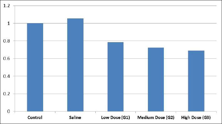 Fig. 4. Ratio of liver weight to body weight. Table 2. The toxic effects of varying concentrations of CNPs on liver function markers in male Sprague–Dawley rats following a 28-day intraperitoneal exposure, expressed as mean (±SD).