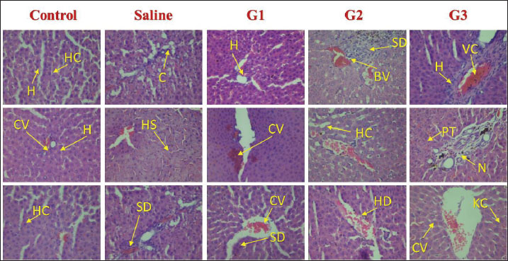 Fig. 6. Photomicrographs of liver tissue from male Sprague–Dawley rats administered with different doses of CNPs captured at 40x magnification. Histological examination of H&E-stained liver tissues revealed a progressive pattern of hepatic damage across the experimental groups. The control group exhibited normal liver architecture with intact central veins (CV) and hepatic cords (HC). The saline group remained largely normal, with only mild SD. Early signs of liver injury appear in Group 1 (G1), including mild congestion (C) and hepatocyte (H) swelling. Group 2 (G2) exhibited moderate damage, with evident vascular congestion (VC), HD, and inflammatory infiltration. The most severe changes are seen in Group 3 (G3), where advanced liver injury is indicated by marked necrosis (N), cytoplasmic vacuolation (CV), hemorrhage (H), and disorganized hepatic structure. These findings show that the experimental compound likely induces a dose-dependent hepatotoxic effect. HC, Hepatic Cords; H, Hepatocytes; C, Congestion; BV, Blood Vessel Congestion; SD, Sinusoidal Dilation; HS, Hepatic Sinusoids; HD, Hepatocellular degeneration; VC, Vascular Congestion; PT, Portal triad; CV, Cytoplasmic Vacuolation; N, Necrosis; KC, Kupffer Cells. Body weight alterations are one of the primary markers of systemic toxicity. Rats that received higher CNP doses lost substantial amounts of weight because the accumulation of nanoparticles within their bodies affected their metabolic processes. CNP exposure led to major changes in body weight, serum biochemical data, and oxidative stress readings, suggesting that liver dysfunction might persist and affect overall wellness (Zhang et al., 2019a; Singh et al., 2020a). It has also been established through rodent nanoparticle research that weight loss occurs due to oxidative stress and inflammation, which disrupts both nutrient absorption and energy metabolism (Chen et al., 2019a; Singh et al., 2020ab). In the current study, both liver and body weight were found to be decreased. Weight reduction in the low-, medium-, and high-dose groups implies that CNP contact harms regular metabolic operations by potentially destructive hepatic means. Weight loss appears due to liver dysfunction because this organ leads protein synthesis and energy regulation, similar to impairments that result in weight loss (Ali et al., 2018). In the present study, studies on liver function biomarkers showed that Group 3 had the same cholesterol level as the control and low TG, LDL, and HDL levels. A more plausible explanation could be that an unknown genetic or enzymatic feedback mechanism has been triggered, which could initiate metabolism detoxification. However, the liver weight showed a significant decrease, revealing a high level of toxicity, which is supported by images. The altered levels of ALT, AST, ALP, and bilirubin, along with the A/G ratio, demonstrated the hepatotoxicity of CNP exposure. The release of ALT and AST enzymes in the bloodstream indicates liver cell damage because these enzymes come from damaged cells (Aebi, 1974; Adedara et al., 2018; Ahmadi et al., 2017a, 2017b; Garcia-Garcia et al., 2021). Elevated ALP activity indicates hepatobiliary stress, which possibly arises from damaged bile ducts (Kumari et al., 2018). The research findings support previous observations about nanoparticles, which demonstrate elevated bilirubin levels mainly seen in the high-dose group because of nanoparticle-induced oxidative stress and liver functional impairment (Abdelhalim and Jarrar, 2016). The researchers observed no substantial variations in total bilirubin levels during the study period, indicating that CNP exposure affects liver function but does not cause major disruptions to bilirubin metabolic processes (Kim et al., 2024a). Research findings demonstrating alterations in lipid metabolism strongly demonstrate that workplace exposure to CNP causes liver toxicity. The statistical analysis using ANOVA revealed substantial modifications in LDL cholesterol (p=0.012) and triglyceride (p=0.012) levels, together with HDL cholesterol (p=0.008) levels, indicating aberrant lipid homeostasis. Previous research has demonstrated how nanoparticle exposure leads to disturbances in lipid profiles, which may occur through oxidative stress pathways (Chen et al., 2019b; Liu et al., 2020; Zhang et al., 2021a–c). The findings of increased ALP levels (p=0.009) support the mechanism that CNPs disrupt hepatic lipid metabolism according to studies showing how nanoparticles cause hepatic stress and biliary dysfunction (Sun et al., 2018). The absence of significant changes in total protein and globulin levels (p > 0.05) demonstrates that CNP exposure causes minimal impairment of protein synthesis or metabolism according to results reported by Chen et al. (2014). The statistically significant change in A/G ratio (p=0.020) implies that CNPs might affect the relationship between albumin and globulin, as experts have associated this pattern with oxidative stress changes in protein distribution changes in prior research (Zhou et al., 2020). The multiple hepatotoxic effects of CNPs occur through oxidative stress, inflammatory mechanisms, and cellular interactions. Scientific evidence demonstrates that nanoparticles trigger the production of ROS, which generates lipid peroxidation alongside protein damage and mitochondrial impairment, leading to cellular death (Xia et al., 2009). The presence of nanoparticles within liver tissues results in signaling pathway activation, which subsequently causes hepatocellular damage and liver dysfunction (Sharma et al., 2021). The present results establish that extended CNP exposure damages liver function via oxidative and inflammatory responses. Under a microscope, research on liver tissues demonstrated the harmful reactions that stem from CNP exposure. All dosage levels in the high-dose groups provoked cellular degeneration of hepatocytes with vacuolation, while inflammatory infiltration