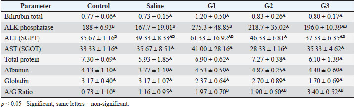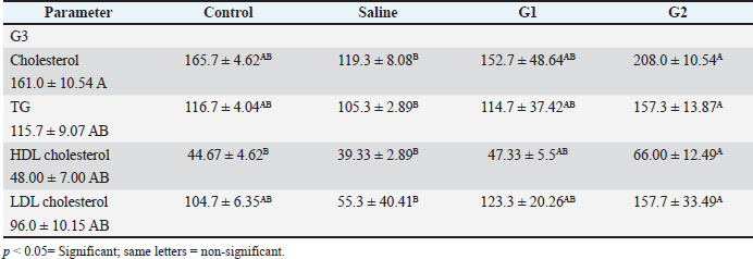 Fig. 5. Graph of the lipid profile. The current findings from rats that received higher doses of CNPs indicate that systemic toxicity might exist. A substantial decline in the movements of rats became apparent along with a decrease in appetite and a major weight reduction when rats were given CNPs at doses of 19.5, 58.5, and 97.5 mg/kg, respectively, but normal expressions remained constant for both the control and saline groups. Consistent with previous research, nanoparticle contact has been found to induce physiological pressure along with metabolic system modifications (Nakamura and Watano, 2018; Singh et al., 2020a; Zhang et al., 2021a–d; Nasim et al., 2024). Table 3. Effects of CNP exposure on rat liver function and protein profile.