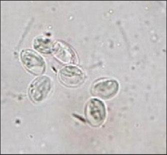 Fig. 1. Concentration method for Giardia intestinalis cyst in fecal samples of water buffalo, oval in shape with four nuclei (100×). Total infection rate of G. intestinalis in water buffaloThe prevalence of G. intestinalis in water buffalo showed a significant (p < 0.05) difference between the microscopic (13.88%) and molecular (30.55%) nPCR techniques (Table 2). Table 2. Total infection rate of Giardia intestinalis in water buffalo by microscopic and molecular (PCR).