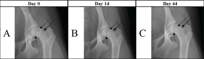 Fig. 1. Images showing reduction in femoral head and neck lysis on days 0, 14, and 44. Radiographs A and B show a decrease in the radiopaque contrast of the bone tissue (black arrows). In C, the same bone areas are homogeneous compared with other bone regions. The degree of lameness in the animal was assessed at each visit (days 0, 14, and 44) using the previously described six-point lameness scoring system (0–6) outlined by Carr DL Dycus (2016). ROM: The animals were positioned in lateral recumbency, and a conventional goniometer was placed with its fulcrum aligned over the hip joint. The pelvic axis served as the reference line, and the longitudinal axis of the femur was utilized to measure the ROM of the hip joint, following the method described by Jaegger et al. (2002). Thigh girth analysis: thigh circumference was measured using a Gulick II measuring tape. Measurements were performed at the mid-point of the femur while the animal was positioned in lateral recumbency with the limb fully extended and under sedation. DiscussionThe case involved an 11-month-old female Toy Poodle weighing 2.5 kg. The owners reported observing hindlimb lameness for approximately 1 month. Despite the previous treatment with oral meloxicam suspension (Melosus 1,5 mg/ml, CP-Pharma Handelsgesellschafts mbH, Germany) at 0.1 mg/kg for 3 weeks, the left hindlimb lameness did not improve. Upon clinical examination, the dog exhibited lameness in the affected limb, thigh muscle atrophy, hip joint crepitus, and painful flexion and extension movements. Radiographic examination confirmed grade 1 LCPD according to the Ljunggren scale (Ljunggren, 1967). On the Day-1 radiograph, there was a reduction in bone density (focal lysis) in the femoral head (Fig. 1A), and the distal margin of the femoral neck was not clearly delineated. 14 days after the PRP injection, follow-up radiographs showed diminished femoral-head lysis, but the head itself had become markedly irregular (Fig. 1B). The distal border of the femoral neck was now distinguishable. In Chinnabrut’s 2022 study, surface deterioration of the femoral head was likewise noted in two of the three cases, although the control radiographs were taken only at 8 weeks. Parra and Silva (2017) study reported a similar worsening of the femoral head surface as early as 15 days post-treatment, and this change persisted throughout the study. By day 44, the bone lysis had stopped, and the distal outline of the femoral neck was still clearly defined (Fig. 1C). In addition, the mild surface irregularity previously seen on the femoral head was partially resolved. In Chinnabrut’s 2022 study, one of the three cases exhibited no femoral head changes; however, radiographs were obtained only twice, in the first 24 hours and again at 8 weeks, so it is impossible to determine whether a transient surface deterioration similar to that observed here developed and later subsided in the interim. Clinically, lameness improved significantly by day 14, although muscle atrophy persisted, and hip flexion and extension pain-free ROM increased. By day 44, lameness had completely resolved, muscle atrophy had ceased with evidence of muscle regeneration, and both hip flexion and extension were pain-free (Table 1). Chinnabrut and Soontornvipart (2022) reported that lameness resolved in two of three dogs and improved in the third by eight weeks posttreatment. In contrast, Parra and Silva (2017) reported a transient worsening at Day 15, followed by full resolution by Day 30. These findings align with our own results, in which we documented significant clinical improvement—including resolution of lameness—was documented by Day 44. Collectively, the evidence suggests that measurable clinical benefits after intraarticular PRP may require at least 30 days to become apparent. The transient inflammation and pain seen after PRP administration may stem from proteins released by platelet α-granules: these proteins up-regulate inflammatory receptors that enhance platelet adhesion to other cells and release multiple chemokines (Blair and Flaumenhaft, 2009). Hip-joint range of motion improved in both the Chinnabrut and Soontornvipart (2022) and Parra and Silva (2017) series, although direct comparison is impossible because different scoring systems were used. Thigh-girth measurements in this case showed progressive muscle-mass gain from day 1 to day 44, despite a transient setback on day 14. Similarly, Chinnabrut and Soontornvipart (2022) recorded increased thigh muscle mass in two dogs that became sound, whereas the dog with residual lameness exhibited no muscular improvement. Table 1. Comparative results of lameness scoring, hip joint range of motion (ROM) during flexion and extension, and thigh girth measurements of both hind limbs on different assessment days following PRP injection.