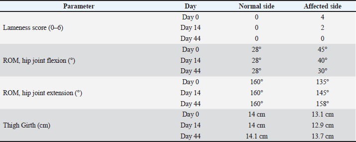 The owners observed a notable improvement as early as 3 days following the initial PRP injection, an outcome not previously achieved with nonsteroidal anti-inflammatory drug treatment. Intraarticular PRP injections successfully alleviated pain and resolved lameness over the 44-day study period. No adverse effects were observed. The improvement in lameness was confirmed by increased ROM and thigh girth measurements. Although the radiographic changes on day 14 were not considered significant, clinical improvement was evident. By day 44, radiographs revealed halted lysis and increased bone tissue density (Fig. 1C). Similar observations of radiographic changes alongside clinical improvement were noted by Chinnabrut and Soontornvipart (2022). PRP is an autologous fluid concentrate primarily composed of platelets and various growth factors. Recent studies have demonstrated the role of PRP in promoting healing through the provision of growth factors, cytokines, chemokines, and other bioactive compounds (Boswell et al., 2012; Abrams et al., 2013; Pelletier et al., 2013; Hsu et al., 2013). These cytokines and growth factors effectively mitigate inflammation and initiate anabolic processes and tissue regeneration (Arnoczky and Shebani-Rad, 2013), as demonstrated by the cessation of femoral head and neck lysis observed in this study. In the Parra and Silva (2017) and the Chinnabrut study (2022), most animals demonstrated a positive clinical outcome after PRP injection, regardless of age or LCPD severity, as reflected by improvements in gait, range of motion, and pain. However, not all animals exhibited significant radiographic changes (Chinnabrut and Soontornvipart, 2022). Disease severity significantly influences treatment plans, and intraarticular PRP injections may be beneficial in early or mild stages of Legg-Calvé-Perthes disease but are not recommended for advanced or severe cases because of limited efficacy (Harper 2017; Crovace et al., 2020). The limitation of this study was the small number of suitable LCPD cases for PRP injection. LCPD is an uncommon disease and is sometimes misdiagnosed, leading to delayed diagnosis and rapid disease progression. ConclusionIntraarticular PRP injection effectively managed early-stage LCPD in a dog, demonstrating clinical improvement and bone healing promotion. The results of our study suggest that surgical treatment is a promising alternative treatment in early-stage LCPD. AcknowledgmentsNone reported. Conflict of interestThe authors have no conflicts of interest to declare. FundingThe authors have nothing to disclose. Authors’ contributionDVM Viktoras Sinkevičius: investigation and writing; DVM Matas Klupšas: investigation, writing, and preparation of the manuscript; PhD DVM Dmitrij Kvitka: revision and correction of the manuscript; DVM Martinas Jankauskas: supervision, revision, and correction of the manuscript. All authors have contributed to the study and approved the submitted version. Data availabilityAll relevant data are included in the revised manuscript. ReferencesAbrams, G.D., Frank, R.M., Fortier, L.A. and Cole, B.J. 2013. Platelet-rich plasma for articular cartilage repair. Sports Med. Arthroscopy Rev. 21, 213–219. Aguado, E. and Goyenvalle, E. 2020. Legg-Calvé-Perthes disease in the dog. Morphologie 105, 143–147; doi:10.1016/j.morpho.2020.11.011 Arnoczky, S.P. and Shebani-Rad, S. 2013. The basic science of platelet-rich plasma (PRP): what clinicians need to know. Sports Med. Arthroscopy Rev. 21, 180–185. Blair, P. and Flaumenhaft, R. 2009. Platelet α-granules: basic biology and clinical correlates. Blood Rev. 23, 177–189. Boswell, S.G., Cole, B.J., Sundman, E.A., Karas, V. and Fortier, L.A. 2012. Platelet-rich plasma: a milieu of bioactive factors. Arthroscopy 28, 429–439. Carr, D.L.D. 2016. Rehabilitation and gait analysis. In Clinician’s Brief, Tulsa, OK: Educational Concepts LLC, pp 93–100. Catarino, J., Carvalho, P., Santos, S., Martins, A. and Requicha, J. 2020. Treatment of canine osteoarthritis with allogeneic platelet-rich plasma: review of five cases. Open Vet. J. 10(2), 226–231; doi:10.4314/ovj.v10i2.12 Chinnabrut, P. and Soontornvipart, K. 2022. Preliminary: the platelet-rich plasma intra-articular injection application for canine Legg-Calvé-Perthes disease treatment. Thai J. Vet. Med. 52(Suppl.), 53–54. Crovace, A.M., Lacitignola, L., Staffieri, F., Francioso, E., Rossi, G. and Crovace, A. 2020. Treatment of monolateral Legg-Calvé-Perthes disease with autologous bone marrow mononuclear cells in 32 dogs. VCOT. Open 3, 1; doi:10.1055/s-0040-1701470 Cuervo, B., Rubio, M., Chicharro, D., Damiaá, E., Santana, A., Carrillo, J.M., Romero, A.D., Vilar, J.M., Cerón, J.J. and Sopena, J.J. 2020. Objective comparison between platelet rich plasma alone and in combination with physical therapy in dogs with osteoarthritis caused by hip dysplasia. Animals 10(2), E175. De La Mata, J. 2013. Platelet rich plasma. A new treatment tool for the rheumatologist?. Reumatología Clínica 9(3), 166–171. Duprey, L.P. and Huff, T.G. 2013. Fundamentals of physical rehabilitation, 4th ed. In: Small animal surgery. Ed., Fossum, T.W. St. Louis, MO: Elsevier / Saunders, pp: 114–130. Eto, H., Yamazaki, A., Tomo, Y., Tanegashima, K. and Edamura, K. 2024. Generation and characterization of mesenchymal stem cells from the affected femoral heads of dogs with Legg-Calvé-Perthes disease. Open Vet. J. 14(5), 1172–1181; doi:10.5455/OVJ.2024.v14.i5.12. Fossum, T.W., Dewey, C.W., Horn, C.V., Johnson, A.L., Schulz, K.S., Willard, M.D., Bahr, A. and Carroll, G.L. 2013. Small animal surgery, 4th ed. St. Louis, MO: Elsevier Mosby, p: 1321. Gato-Calvo, L., Magalhaes, J., Ruiz-Romero, C., Blanco, F.J. and Burguera, E.F. 2019. Platelet-rich plasma in osteoarthritis treatment: review of current evidence. Ther. Adv. Chronic Dis. 10, 1–18. Harper, T.A.M. 2017. Femoral head and neck excision. Vet. Clinics North Amer. Small Anim. Pract. 47(4), 885