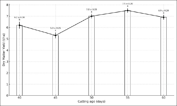 Fig. 1. Dry matter content (%) of Tithonia diversifolia at different cutting ages. Bars represent means ± standard error. No statistically significant differences were found among treatments according to the Kruskal-Wallis test (H(4)=4.00; p=0.406). Different letters above the bars indicate numerical trends although they are not statistically significant. Stomatological analyses revealed moderate differences between the treatments. CP increased from 20.0% (45 days) to 25.1% (60 days). Crude fiber decreased from 9.6% to 8.8%. EE remained between 2.33% and 2.78%. NFE peaked at 55 days (41.2%), while ash content was highest at 50 days (14.19%) (Fig. 2). ME values were estimated between 253.5 and 276.6 kcal/kg DM, peaking at 55 days. DE and GE showed concordant behavior, which was consistent with the increase in AFD and the reduction in NDF.