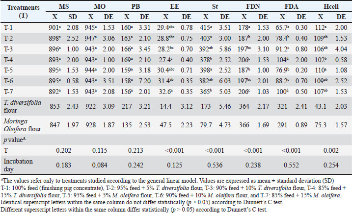In vitro digestibility of Tithonia diversifolia and Moringa oleiferaStomatological analysis of the flours prior to formulation showed that T. diversifolia flour had higher CP (217 g/kg DM) and starch (173 g/kg DM) concentrations than M. oleifera (135 g/kg DM and 79.7 g/kg DM, respectively). Moringa oleifera also had higher EE (47.5 g/kg DM) and Hcell (75.3 g/kg DM) contents. T. diversifolia showed higher AFD (321 g/kg DM) and lower Hcell (43.1 g/kg DM) levels. Stomatological analysis of the experimental diets showed no significant differences (p > 0.05) in DM and OM between treatments. However, there were significant differences (p < 0.001) in NDF, SDF, Hcell, EE, and starch (St), with T-1 having the lowest fiber and the highest St values (Table 5). Table 5. Proximate chemical analysis of dry matter (DM, g/kg as feed), organic matter (OM), crude protein (CP), ether extract (EE), starch (St), neutral detergent fiber (NDF), acid detergent fiber (ADF), and hemicellulose (Hcell), (g/kg DM) of the studied treatments and of the T. diversifolia and M. oleifera flours (n=3).