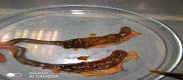 Fig. 3. The cecum is filled with blood, and the mucous is damaged. Direct examination of the fecal samplesMicroscopic diagnosis, which focuses on evaluating the oocyst size and shape (Fig. 4).