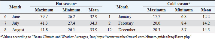 AbstractBackground: This study aimed to examine the effect of vitamin E injection and seasonal changes on semen characteristics (pH, ejaculation volume, mass motility, progressive motility, sperm concentration, live sperm, dead sperm, and abnormal sperm) in rams. Aim: This study aimed to evaluate the effectiveness of vitamin E injections in improving semen characteristics in rams. Methods: Twenty-one healthy rams were randomly divided into three groups (7 animals for each group) as follows: (1) control group injected with saline solution, (2) rams injected with 2 ml of vitamin E, and (3) rams injected with 4 ml of vitamin E. All doses were injected intramuscularly every 2 weeks during the cold season from December to the end of February 2022 and the hot season from June to the end of August 2023. Results: The results showed significant (p < 0.05) differences between the treated groups in most of the semen characteristics. In summer, all of the semen characteristics were significantly increased (p < 0.05), except for the count of dead and abnormal sperm, compared with those in winter. Rams treated with 4 ml of E vitamin caused a significant increase (p < 0.05) in all semen characteristics, while this dose significantly decreased (p < 0.05) the percentage of dead and abnormal sperm in comparison with the control. Conclusion: The study suggests that treating rams with 4 ml of vitamin E during the hot season could improve semen characteristics such as pH, ejaculation volume, mass motility, progressive motility, sperm concentrations, and live sperm. Keywords: Vitamin E, Seasonal, Semen characteristics, Rams. IntroductionMany studies have indicated the role of vitamin E in increasing sexual desire and improving the characteristics and quality of semen in men (Al Rifaie et al., 2023). Seasonal factors (months of the year) may influence the sexual behavior of males through many factors, such as temperature, the rate of rain flow, lighting, available food, age, geographic location, humidity and rate and short generation period (Rosa and Bryant, 2003; Al-Ghalban et al., 2004; Farshad et al., 2012; Eman, 2019; and Ayyat et al., 2021). These factors play a role in stimulating or inhibiting sexual testosterone secretion, spermatogenesis, testicular size, and scrotal circumference (Zamiri and Khodaei, 2005; Kridli et al., 2007; Tajangookeh et al., 2007). Vitamins are organic compounds used in small doses. Vitamin E and selenium are powerful antioxidants that enhance animal immunity by protecting cells and tissues from oxidative damage caused by peroxides and free radicals. In addition, they play a significant role in boosting and improving fertility (Anita and Jacyno, 2005; Yue et al., 2010). Furthermore, vitamin E plays an essential role in improving semen characteristics by improving sperm motility and increasing the concentration of sperm in the ejaculate, which leads to improved fertility rates in rams (Yousef et al., 2003). Vitamin E plays an important role in improving the characteristics of male semen in terms of maintaining sperm concentration, increasing and improving motility rates, maintaining sperm membranes, and balancing osmotic pressure within the sperm membrane (Ammar Bin et al., 2009; Soleimani et al., 2009; Mahmoud et al., 2013). Vitamin E and selenium (Se) are important nutrients that act synergistically and can affect several biological processes, including spermatogenesis and semen quality (Yousuf et al., 2003; Hussain et al., 2012). They also play a role in smooth and skeletal muscle movement by elevating the rates of Ca++ and P absorption (Holick, 2006). In rabbits, Al-Rifaie et al. (2023) suggested that a diet supplemented with nutrients such as selenium and vitamin E can improve the health status of male rabbits and enhance the physical characteristics of their semen. Therefore, this study aimed to evaluate the effects of vitamin E injections during different seasons (winter and summer) on the characteristics of ram semen. Materials and MethodsThis study was conducted in the animal field of the College of Agriculture at Basrah University from December to the end of February or 2022 (winter season) and from June to the end of August or 2023 (summer season) to study the effect of vitamin E injection on the fresh semen characteristics of rams during different months. Twenty-one healthy rams, aged (2.0–2.5) years old and weighing (45–50 kg body weight), were randomly divided into three groups (7 animals for each group) as follows: (1) the control group was injected with saline solution (0.9%); (2) the rams were injected with 2 ml of vitamin E (Tianjin Glory Technology Co., Ltd., China); and (3) the rams were injected with 4 ml of vitamin E intramuscularly every 2 weeks. All animals were housed in the semi-open yard and fed the same diet, which included 400 g/head of concentrate food (45% barley, 40% wheat bran, 10% yellow corn, and 5% fish meal). Additionally, they were grazed on natural pasture during the day (from 7:00 to 11:00 o`clock in the morning and from 3:00 to 6:00 o`clock in the evening), and clean water was preferred ad libitum. Table 1 shows the means of maximum and minimum temperatures in the months of the experiment. Table 1. Mean of the maximum and minimum temperatures (°C).