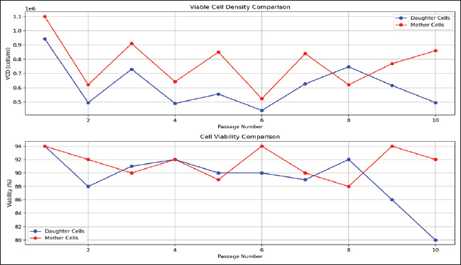 Fig. 2. Two important aspects of cell growth during the suspension adaptation process for both mother and daughter BHK cells: (a) the upper graph illustrates the VCD measured across passages, comparing mother and daughter cells during the transition from adherent to suspension culture. (b) The lower graph displays the cell viability percentage throughout the adaptation process, indicating changes in cell health with successive passages. Cell morphologyA 10 ml sample from a culture adapted to BHK-S was cultured to 25 cm2 T.C. and incubated at 37°C after 4 hours. BHK-S returned to its adherent state and obtained uniform cells, but infected UN-embedded cells were observed due to the high number of ruptured cells caused by the lytic effect of FMDV. Growth analysis (doubling time) of BHK-S cellsMeasuring VCC at different times, 0, 16, 24, 28, and 42 hours, as shown in Table 2. After the calculation, the doubling time was 23.36 hours. The growth kinetics of BHK-21 cells during suspension adaptation, as shown in Fig. 4, were monitored over 42 hours. The initial seeding density was 4.8 × 105 cells/ml, and the cells underwent distinct growth phases throughout the cultivation period. During the lag phase (0–16 hours), cells adapted to the suspension conditions, reaching 8.94 × 105 cells/ml. The exponential growth phase occurred between 16 and 24 hours, during which the cell density increased to a maximum of 9.43 × 105 cells/ml. The specific growth rate (μ) during the exponential phase was 0.0297 hour−¹, corresponding to a doubling time of 23.36 hours. A brief stationary phase was observed around 24–28 hours, followed by a decline phase. During the death phase (28–42 hours), cell viability decreased significantly with a death rate of 0.0664 h−¹, resulting in a final cell density of 3.1 × 105 cells/ml at 42 hours. The growth kinetics demonstrated good correlation with exponential growth modeling (R²=0.9327), indicating consistent cell proliferation during the exponential phase.