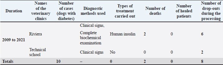 where f is the observed proportion and n is the sample size. Data processing and analysisAll data were digitally recorded using KoboCollect and later transferred to Microsoft Excel and SPSS for statistical analysis. Descriptive statistics (frequencies, means, and standard deviations) were computed. Comparisons between variables (e.g., age, sex, and breed vs. diabetic status) were conducted using the chi-square test or Student’s t-test, with significance set at p < 0.05. Confidentiality was ensured by anonymizing the personal identifiers (names, addresses, and contact information of the clinic owners). Ethical approvalThe study was conducted with the approval of the « Comité du département de Médecine Vétérinaire de l’Institut Supérieur des Sciences et de Médecine Vétérinaire de DALABA » under the following number DMV0352021. The animal experimentation was conducted under the supervision of the Cabinet Veterinaire WOULADA under Number 18418F. ResultsResults of surveys among veterinarians and archives analysisConsultation was held with veterinarians from the Department of Veterinary Services and private veterinarians practicing in the urban commune of Cocody. These included professionals from the Latrille Veterinary Clinic, Akwaba Veterinary Practice, Angré Veterinary Clinic, Riviera Veterinary Clinic, and Technical High School Veterinary Clinic. During the interviews, due to a lack of previous studies on canine diabetes, no comprehensive data were available on the affected canine population (Table 1) or on the main causes of the disease. However, the analysis of the archives revealed the previous presence of the disease, with approximately 10 cases reported, mainly in older dogs. Diagnoses were most often based on clinical suspicion alone. The lack of specific veterinary treatments, combined with the high cost of care, often led owners to abandon their affected animals. Some corticosteroids, such as cortisol and prednisolone, have been reported to be administered at specific doses in treatment protocols. Furthermore, the interviewed veterinarians did not know the types of food provided by the owners to the animals. Table 1. Diabetes mellitus status in dogs according to private clinics.
