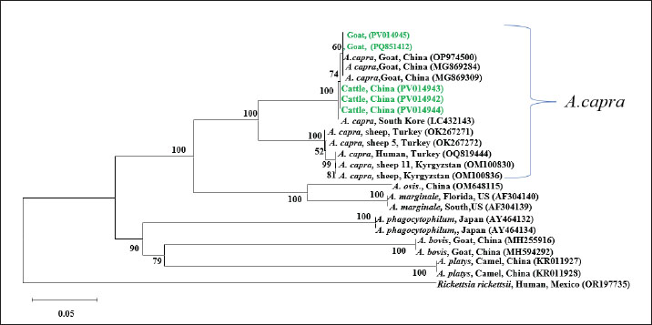 Fig. 1. Phylogenetic tree constructed based on A. capra gltA (594bp). The tree was constructed using the Neighbor-Joining method in MEGA 11, with 1000 bootstrap replicates. Rickettsia rickettsii (OR197735) was used as the outgroup. The sequences obtained in this study are highlighted in green in the figure. The groEL gene sequences (PQ851415, PQ851416, and PQ851417) and 16S rDNA sequence (PQ895775) shared 99.63%–100% identity with reference A. bovis sequences available in GenBank (S1). Phylogenetic analysis based on groEL sequences divided A. bovis into three clusters. The goat-derived sequence PQ851416 was grouped with isolates from South Korean black goats (MW122304, MW122305), while the cattle-derived sequence PQ851417 clustered with HbYS56 (OR555737), isolated from the Chinese H. longicornis. The goat-derived PQ851415 sequence was more closely related to PQ851417, forming a distinct branching node with it (Fig. 2).