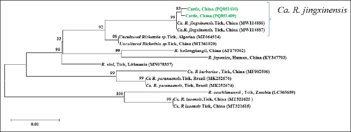 Fig. 4. Phylogenetic tree constructed based on SFGR ompA (532bp). The tree was constructed using the Neigh-bor-Joining method in MEGA 11, with 1,000 bootstrap replicates. The sequences obtained in this study are highlighted in green in the figure. DiscussionIn this study, we screened cattle and goats from the Dejiang region for Anaplasma spp. and Ca. R. jingxinensis, identifying several important Anaplasma species and providing the first global molecular evidence of Ca. R. jingxinensis infection in cattle. These findings highlight the need for sustained surveillance of Anaplasma and SFGR in local ruminant populations to prevent the emergence and spread of tick-borne diseases, which pose risks to both animal and human health. In this study, the overall infection rate of Anaplasma in cattle (29.41%) was found to be higher than previously reported across 12 provinces in China (13.2%) (Qiu et al., 2016). The overall infection rate in local goats (82.35%) was also markedly higher than that reported in Anhui (14.7%) (Wu et al., 2024), and Hainan (30.1%), but was consistent with a previously reported prevalence in Guizhou goats (79.31%) (Han et al., 2024). This regionally elevated prevalence may be attributed to the high abundance of R. microplus and H. longicornis in the region. Previous studies have shown that cattle and goats in this area are frequently infested with these tick species, facilitating Anaplasma transmission (Wang et al., 2021). Among the identified Anaplasma species, A. capra and A. bovis, goats exhibited significantly higher infection rates than cattle. Previous studies have not identified any host preference between these two pathogens in cattle and goats (Chimnoi et al., 2025), which may be related to local animal migration patterns and management practices. Locally, goats are typically grazed in the mountains for extended periods, resulting in a more complex range of activities, time, and habitats. In contrast, cattle generally graze on grasslands around farms, and their grazing time is shorter than that of goats because some are supplemented with artificial feeding. This difference in grazing behavior increases the likelihood of goats coming into contact with blood-sucking tick vectors. Anaplasma capra is a recently discovered zoonotic pathogen in China (Seo et al., 2020). It has been reported in several provinces across China, including Gansu, Guangxi, Guizhou, Chongqing, Shaanxi, Henan, Shandong, Hubei, Sichuan, Guangdong, Liaoning, Hainan, and the Qinghai-Tibet Plateau (Yang et al., 2017; Altay et al., 2024; Ma et al., 2024; Tang et al., 2024; Xue et al., 2024). Additionally, A. capra has been detected in various countries worldwide, including the Republic of Angola, Brazil, Kyrgyzstan, Greece, France, Sweden, Spain, South Korea, and Turkey (Calchi et al., 2020; Barradas et al., 2021; Jouglin et al., 2022; Remesar et al., 2022; Saratsis et al., 2022; Lysholm et al., 2023; Seo et al., 2023; Addo et al., 2024; Kim et al., 2024; Oguz et al., 2024). Anaplasma capra is transmitted by various species of hard ticks, which are widely distributed and can infect zoonotic hosts and domestic animals (Peng et al., 2018). It has been detected in 14%–18% of small ruminants, such as goats and sheep (Yang et al., 2017; Peng et al., 2018), and has also been reported to infect dogs, water buffalo, and cattle (Sahin et al., 2022). The gltA gene of A. capra appears to be particularly susceptible to variation driven by host factors. In this study, A. capra strains derived from cattle clustered into a distinct subclade, a phenomenon previously observed in other studies (Peng et al., 2018; Peng et al., 2021). However, the mechanisms underlying this variation and their potential biological impacts on the host require further investigation for a clearer understanding. In 2015, human cases of A. capra infection were first reported in China (Li et al., 2015). Infected individuals may present with symptoms such as fever, headache, malaise, dizziness, chills, nausea, vomiting, and diarrhea, as well as abnormal laboratory findings, including elevated liver transaminase levels, leukopenia, and thrombocytopenia (Altay et al., 2024). Although A. capra isolated in this study is distantly related to human isolates in the phylogenetic tree, there is currently no evidence to exclude its potential to infect humans. The potential risk of cross-species transmission should not be overlooked. Cattle and goats are primary reservoir hosts of A. bovis (Atif, 2016). Previous studies have reported A. bovis infection rates in animal hosts in China ranging from 4.5% to 49% (Guo et al., 2020), with infection rates in cattle in Japan (53%) (Ooshiro et al., 2008), South Korea (18.2%), and goats (0.5%) (Miranda et al., 2021). In this study, the infection rate of A. bovis in cattle (17.64%) falls within this range, although it is notably lower than that in goats (66.67%). Phylogenetic analysis revealed regional differences in A. bovis, suggesting the presence of distinct circulating strains in the area. We hypothesize that this diversity may be linked to the region’s intensive livestock trade, which hosts the largest cattle and goat trading market in northeastern Guizhou. The movement of animals likely introduces ticks carrying diverse A. bovis strains from different regions. Consequently, it is crucial to enhance public awareness of tick-borne pathogen control in livestock trade markets. Further epidemiological research is required to explore the relationship between livestock trade, strain transmission, and A. bovis genetic diversity. A. bovis has been identified as a zoonotic pathogen, with reported cases in regions such as Anhui, Jiangxi, and Ganzhou in China, as well as in the United States (Karpathy et al., 2023; Lu et al., 2019). Although most animals infected with A. bovis show no clinical symptoms, human infections may present with fever (up to 39°C), chills, headache, myalgia, anorexia, rash, cold sweats, di