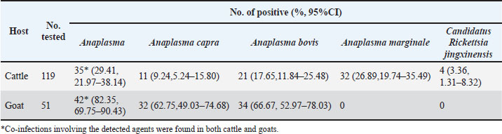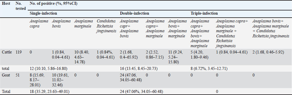 Genetic and evolutionary analysisThe PCR products were electrophoresed on a 1.5% agarose gel, and the UV imaging system was used to visualize the bands. If more than 10 positive bands were detected, 50% were randomly selected and sent to Chongqing BGI for Sanger sequencing. If fewer than 5 positive bands were detected, all were subjected to sequencing. The obtained sequences were compared with gene sequences registered in the GenBank database using the BLAST tool from the National Center for Biotechnology Information (NCBI). Representative sequences were selected, and a phylogenetic tree was constructed using the neighbor-joining method with 1,000 bootstrap replicates in MEGA 11 software. Statistical analysisCount data are presented as numbers (%, 95% CI). The 95% confidence intervals (95% CI) were calculated using the Wilson score method, which provides more accurate interval estimates, especially for small sample sizes or proportions close to 0 or 1. The chi-square test (χ²) was used to compare differences in pathogen positivity rates between and within the cattle and goat groups. Fisher’s exact test was applied when the chi-square test assumptions were not met. A significance level of 0.05 was used for all analyses. Statistical analyses were conducted using the SPSS 27 software. Ethical approvalThe Animal Care Welfare Committee of Guizhou Medical University approved this study (Ethical Approval No. 2305072). All animals were handled in accordance with the Animal Ethics Procedures and Guidelines of the People’s Republic of China. ResultsRates of Anaplasma and SFGR infectionsOut of the 119 cattle screened by PCR, 35 (29.41%, 95% CI: 21.97%–38.14%) were infected with Anaplasma and 4 (3.36%, 1.31%–8.32%) were infected with Ca. R. jingxinensis. Sequencing identified the genotypes of Anaplasma: A. capra in 11 cattle (9.24%, 95% CI: 5.24%–15.80%), A. bovis in 21 cattle (17.64%, 95% CI: 11.84%–25.48%) and A. marginale in 32 cattle (26.89%, 95% CI: 19.74%–35.49%) (Table 2). Among the infected cattle, 12 (10.10%, 95% CI: 5.86%–16.80%) were infected with a single pathogen, 16 (13.45%, 95% CI: 8.45%–20.73%) were co-infected with two pathogens, and 8 (6.72%, 95% CI: 3.45%–12.71%) were infected with three pathogens (Table 3). The infection rate of A. marginale was significantly higher than that of A. capra (χ2=12.52, p < 0.001), whereas no significant differences were observed between A. marginale and A. bovis (χ2=2.94, p=0.087) or between A. bovis and A. capra (χ2=3.61, p=0.057). Table 2. Overall Prevalence of Anaplasma and Ca. R. jingxinensis in cattle and goat.