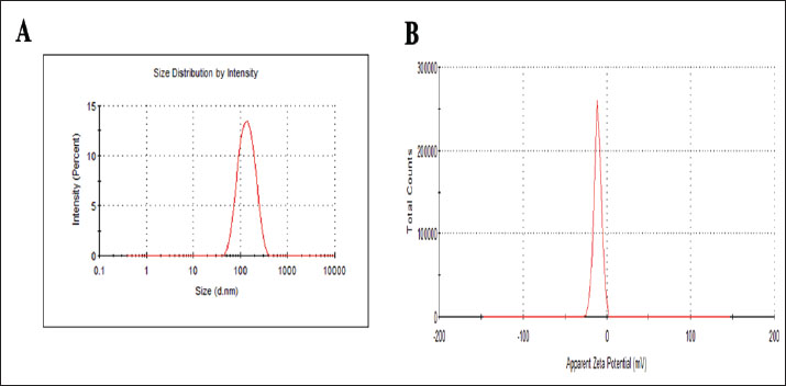 Histopathological examinationThe adipose tissue was excised and handled with caution to minimize any damage to the tissue using a 21-gauge needle before immersion in modified Davidson’s solution for 24 hours (Bancroft and Layton, 2013). Next, the adipose tissue was processed for paraffin infiltration and embedding, and 4–5 µm thick transverse tissue sections from the middle portion of the testicles were prepared, stained with hematoxylin and eosin (Erfan, 2017), and examined microscopically. Statistical analysisWe utilized GraphPad INSTAT software (Version 2) to conduct the statistical analysis. The statistical assessment involved applying a one-way analysis of variance and Tukey's multiple range test. The results comprise the presentation of SE and SEM differences. Significance was determined by considering a p-value of 0.05 or less. Ethical approvalThe ethics committee at Zagazig University's Faculty of Veterinary Medicine in Egypt carefully reviewed and gave its approval to the research protocol. All steps of the study were conducted by the relevant laws and regulations (approval number: ZU-IACUC/2/F/187/2022). The research was also carried out following the guidelines set forth by ARRIVE to ensure the highest standards of research conduct. ResultsCharacterization of CA-LipThe ethanol injection method was employed to fabricate CA-Lip, which was subsequently characterized using several analytical techniques, including particle size analysis, polydispersity index (PDI), zeta potential measurement, and encapsulation efficiency. The average particle size of the CA-Lip, determined via Zetasizer Nano, was found to be 125.1 ± 12.6 nm (Fig. 1A). The PDI of 0.27 indicated a relatively narrow size distribution, suggesting a uniform dispersion of the liposomal particles. The zeta potential of the niosomal systems was measured at −15 ± 0.84 mV (Fig. 1B), reflecting a moderate negative surface charge, which is indicative of the stability of the formulations. The encapsulation efficiency of the CA-Lip was determined to be 82% ± 3.6%, indicating a substantial entrapment of the active compound within the vesicles.