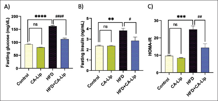 Fig. 3. Influence of CA-Lip on fasting glucose, insulin, and HOMA-IR levels in HFD-fed rats. The levels of fasting glucose (A), insulin (B), and the scores for HOMA-IR (C) were measured for the different groups. ****p < 0.0001, ***p < 0.001, **p < 0.01, #p < 0.05 versus HFD group, ns indicates nonsignificant. Data are presented as the mean ± SEM (n=10). Effect of CA-Lip on adipokines changes in HFD-fed ratsWhen compared to the negative control, HFD dramatically decreased the levels of blood adiponectin by 61% and increased serum leptin by 75%. CA-Lip administration significantly decreased serum leptin levels by 34% and significantly inhibited serum leptin levels by 100% in the HFD-fed group. CA-Lip group showed almost similar effects on adipokine levels compared to the control rats (Fig. 4A and B).