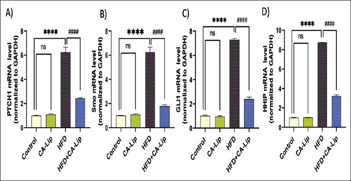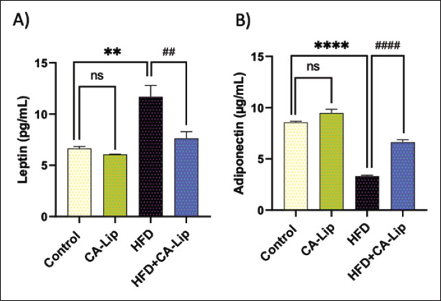 Fig. 5. Effect of CA-Lip on leptin and adiponectin in HFD-fed rats. Data are presented as the mean ± SEM (n=10).****p < 0.0001, **p < 0.0, ####p < 0.0001, ##p < 0.01 versus HFD group, ns indicates nonsignificant. CA-Lip regulates the Hh pathway in adipose tissue of HFD-fed ratsProtein patched homolog 1 (PTCH1), Smo, glioma-associated oncogene homolog 1 (Gli1), and Hh-interacting protein (HHIP) relative mRNA expression were significantly upregulated in obese rats by 470%, 450%, 580%, and 725%, respectively, compared to the control group. The treated rats showed a considerable decrease in PTCH-1, Smo, Gli-1, and HHIP expression by 57%, 73%, 64%, and 60%, correlated with the obese group. There was no obvious statistically significant difference between the CA-Lip group and the control group. The CA-Lip group showed a decrease in PTCH-1, Smo, Gli-1, and HHIP expression by 10%, 11%, 6%, and 2%, compared to the control group (Fig. 7 A–D).