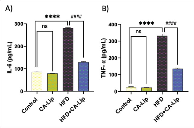 Fig. 4. Influence of CA-Lip on serum lipid profile. The levels of TC (A), TGs (B), HDL (C), VLDL-C (D), and LDL-C (E) were measured for the different groups. ****p < 0.0001, ***p < 0.001, ####p < 0.0001 versus HFD group, ns indicates nonsignificant. Data are presented as the mean ± SEM (n=10). CA-Lip suppresses proinflammatory cytokines in HFD-fed ratsThe present research identified several significant proinflammatory cytokines associated with obesity. The pro-inflammatory cytokines TNF-α and IL-6 had significantly higher (p < 0.05) levels in rats on an HFD. They were significantly suppressed (p < 0.05) by CA-Lip administration (Fig. 5A and B). These findings imply that CA-Lip could reduce systemic inflammation driven by obesity.
