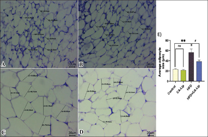 Fig. 8. Representative photomicrographs of H&E-stained sections from abdominal fat (Scale bar 20 μm) in rats (A–D) and a representative graph illustrating average adipocyte sizes among different groups (E). DiscussionThe global obesity epidemic, influenced by genetics, fast food, and urban decline, is causing limited mainstream remedies due to side effects and restrictions, prompting an urgent need for a safe, effective natural alternative (Payab et al., 2020; Aron-Wisnewsky et al., 2021). This research investigates the potential of CA-Lip in combating obesity and promoting a healthy lifestyle. When rats are fed HFD, their body fat percentage increases linearly with their body weight. Our findings indicated that HFD significantly raises body weight levels. The results obtained matched those of Huang et al. (2023), who found a rise in the body weight of HFD-induced obese recipient mice. However, the administration of CA-Lip to obese rats resulted in a notable enhancement in weight loss, suggesting a promising therapeutic avenue for obesity management. A study by Xu et al. (2020) found that administrated CFA at 50 mg/kg BW by daily gavage for 12 weeks significantly reduced body weight in HFD mice. The bioavailability of CA is increased considerably when delivered in liposomal form, allowing for more pronounced biological effects at lower doses. Our results were supported by histopathological examinations, which revealed that CA-Lip could effectively suppress the HFD-associated increase in abdominal fat accumulation and adipocyte size. These findings imply that consuming CA-Lip may be a viable approach for managing and preventing overweight and obesity. Glucose homeostasis encompasses all metabolic processes that help regulate blood sugar levels. Obesity can lead to insulin resistance (IR) due to chronic hyperinsulinemia and inflammatory mediator interference with insulin signaling molecules (Rohm et al., 2022). HFD-fed rats exhibited a rise in fasting blood glucose, insulin, and HOMA-IR. The same findings were found by Huang et al. (2024). Fasting blood glucose, insulin, and HOMA-IR were markedly decreased in CA-Lip in HFD-fed rats. The reduction in HOMA-IR suggests an improvement in insulin sensitivity. CA treatment in chronic restraint stress-induced insulin-resistance mice reduced fasting blood sugar, oxidative stress, and improved insulin sensitivity (Choudhary et al., 2016). Castro et al. (2021) found that treatment with CA (50 mg/kg) managed to lower glucose levels in diabetic rats. These findings support the high therapeutic potential of nanoliposome-encapsulated CA in managing obesity-related hyperglycemia and IR. HFD-induced hyperlipidemia is a suitable model due to its ability to mimic pathological conditions in humans and rats. Feeding with an HFD caused a significant elevation of serum TC, TG, VLDL-C, and LDL-C levels and a marked decrease in HDL-C levels compared to rats fed a normal diet. According to Eynde et al. (2023) , feeding rats HFD results in hyperlipidemia, as demonstrated by a considerable drop in serum HDL-C levels compared to the normal group and a significant increase in serum levels of TC, LDL-C, and TG. HFD can alter fat composition and impact fat breakdown, absorption, and stomach enzyme activation. Elevated TC and LDL-C levels increase the risk of coronary heart disease, while higher HDL-C promotes cholesterol removal from the liver (Saravanan and Ponmurugan, 2012). Dietary cholesterol increases TG levels, which reduces fatty acid oxidation, thereby increasing hepatic and plasma TG levels (Huang et al., 2024). The administration of CA-Lip to HFD rats restored the increase in TG, TC, and LDL-C levels and the drop in HDL-C levels. The observed lipid-lowering effects are consistent with the established role of polyphenolic substances, such as CA, in modifying lipid profiles through inhibiting lipid peroxidation, reducing lipid accumulation, and promoting adipocytes' white-to-brown transition (Mariana et al., 2018). CA down-regulates lipogenesis gene expression of sterol regulatory element-binding protein-1 and target genes, fatty acid synthase, while promoting lipolysis through up-regulation of AMP-activated kinase (Liao et al., 2014). Obesity caused by an HFD is well-known for altering the levels of adipokines in the body. Leptin and adiponectin are types of adipocytokines that originate from fat tissue. Thus, controlling these substances is crucial in preventing metabolic diseases such as obesity (Masuyama et al., 2016). Adiponectin, a hormone produced by adipocytes, has anti-inflammatory, anti-obesity, and antidiabetic properties, while leptin regulates satiety and energy homeostasis. Obesity is linked to lower levels of adiponectin and higher levels of leptin (Clemente-Suárez et al., 2023). Furthermore, HFD-induced mice displayed elevated leptin levels and hyperleptinemia compared to control mice (Yeh et al., 2017). Rats given CA-Lip as a supplement had lower leptin levels than the non-supplemented HFD group, but their adiponectin levels were higher. Specifically, CA-Lip was found to reduce the release of abnormal adipokines by controlling the levels of leptin and adiponectin in the body. Research showed that CA increased the levels of adiponectin receptors like AdipoR1 in the liver of rats (Tian et al., 2025). Additionally, Obesity increases the body's production of pro-inflammatory adipokines, disrupting the balance between pro-inflammatory and anti-inflammatory reactions (Kawai et al., 2021). This is evidenced by the rise in serum pro-inflammatory cytokines such as TNF-α and IL-6 in rats on an HFD. Tarbiah et al. (2024) found that rats given CA (0.8/100 g diet) resulted in significant adjustments of serum proinflammatory cytokines, including IFN-γ, TNF-α, IL-6, and NF-kB in rats fed HFD. Similar results were observed in our study as oral supplementation with CA-Lip alleviated the inflammatory condition, as evidenced by the marked reduction of proin