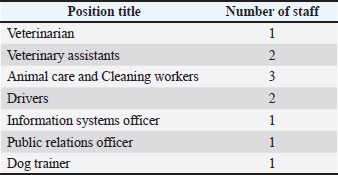 Phase three: evaluation and sustainabilityThis stage aims to maintain a control rate of no less than 70%, with a goal of reaching 80%, especially if permanent centers are established that comply with international standards (Table 3). Table 3. Staff and operational system (Per Shelter, Per Shift).