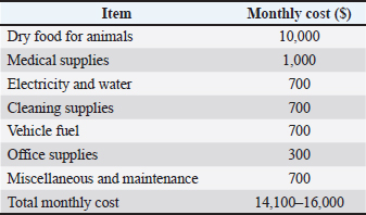 Estimated monthly operating cost per shelter (700 Animals) can be seen in Table 8. Table 8. Estimated monthly operating cost per shelter (700 Animals).