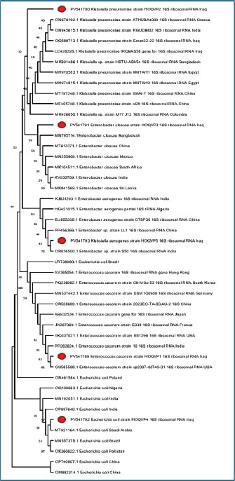 Fig. 2. Phylogenetic tree constructed from 16S rRNA gene sequences illustrating the genetic relationships between bacterial strains isolated from Iraq and reference strains from various countries. The tree highlights the high degree of similarity among the isolates, with GenBank accession numbers provided for accurate identification. The multiple sequence alignment included 45 sequences. These represent local isolates and international reference strains. The alignment length was 100–150 bp. Gaps were introduced for proper alignment. Conserved regions were observed between nucleotide positions 5–20 and 45–70. These sequences exhibited no variation across genera. They may represent the essential domains of the 16S gene. These regions are highlighted in Figure 3.
