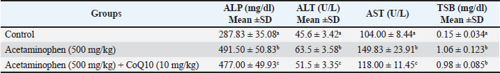 Fig. 1. Differences in liver function parameters between the control, acetaminophen, and acetaminophen + CoQ10 groups. Table 2 illustrates the effect of acetaminophen toxicity and CoQ10 on kidney function tests. The findings revealed a significant increase (p ≤ 0.05) in creatinine and albumin (1.04 m/dl and 4.63 mg/dl, respectively) in the acetaminophen group compared with the control group (0.7 mg/dl and 3.03 mg/dl, respectively), while urea showed no significant change. The table also revealed a significant reduction in creatinine and albumin values (0.93 mg/dl and 3.24 mg/dl, respectively) in the third group (Acetaminophen and CoQ10) as expressed in Figure 2.
