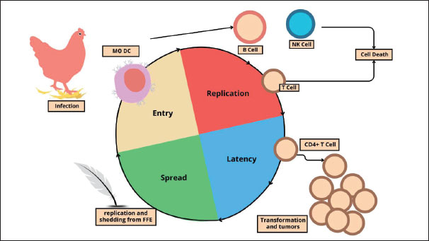 Fig. 2. The pathogenesis cycle of MDV. Virulence factorsThe MDV double-stranded DNA genome is approximately 180 kb long and is made up of internal repeats (Internal Repeat Long and Internal Repeat Short) and terminal repeats (Terminal Repeat Long and Terminal Repeat Short) on either side of the short and long unique regions (US and UL) (Fukuchi et al., 1985). MDV encodes approximately 100 genes involved in different stages of the viral life cycle (You et al., 2021b). These include several virulence factors that promote pathogenesis and tumor development either alone or in combination (Conradie et al., 2020). According to a recent analysis, these variables include the oncoprotein Meq, the viral chemokines vIL-8/vCXCL13, RLORF4, RLORF5a, pp14, and pp38 (Bertzbach et al., 2018b). The majority of earlier studies have concentrated on the function of the virus’s genes that code for proteins (Jarosinski and Osterrieder, 2012; Tai et al., 2017; Trimpert et al., 2017). However, MDV also encodes a rich repertoire of non-coding RNAs (ncRNAs), including miRNAs and viral telomerase RNA (vTR) (Chbab et al., 2010). vTR and its cellular counterpart in chicken have a conserved stem-loop structure and 88% sequence similarity (Fragnet et al., 2003). Furthermore, effective virus-induced tumor growth depends on vTR (Chbab et al., 2010). Inserting chicken TR into the viral genome can restore tumorigenesis in vTR-deficient viruses (Liao et al., 2021). These findings demonstrate that the virus most likely obtained the gene from its host and that cellular TR overexpression can promote tumor development. Two Epstein–Barr virus ncRNAs that share highly conserved cellular contact partners with humans and chickens can likewise partially or fully encode vTR (Kheimar and Kaufer, 2018). Future studies should clarify how vTR and its cellular counterparts change in natural models of this virus-induced tumor development. Additionally, MDV encodes miRNAs that are crucial for latency and carcinogenesis (Liao et al., 2020). To date, 26 mature miRNAs have been identified from 14 miRNA precursors. The MDV repeat region has three clusters of these miRNAs, which are referred to as the Meq-, Mid-, and LAT-clusters (Zhao et al., 2015). They play a role in controlling target genes in cells and viruses. The development and maintenance of latency are facilitated by immediate early gene suppression (Morgan et al., 2008). MDV-miR-M4 is one of the most highly expressed MDV miRNAs and shares the same seed region as the human miRNA miR-155 (Zhang et al., 2019). Like human miR-155, MDV-miR-M4 contributes significantly to tumor development but is not necessary to preserve the altered phenotype or sustain tumor cell growth (Ding et al., 2020). More coding and noncoding sequences that may be crucial for pathogenesis, infection, replication, and dissemination have been identified (Bertzbach et al., 2020). For instance, it identified numerous novel splice variants, including those of known genes such as pp38 (MDV073), UL15 (MDV027), UL49 (MDV062), and pp24 (MDV008) (Volkening et al., 2023). Moreover, polycistronic transcripts, polyadenylation signals, and new poly(A) cleavage sites have been discovered by RNA sequencing (Neve et al., 2017). However, its precise role and significance to the virus life cycle remain unknown. Host rangeBecause chicken breeds vary greatly in their genetic vulnerability, they are by far the most significant natural host (Trapp-Fragnet et al., 2021). MD outbreaks in Japanese quail occur naturally (Adedeji et al., 2019). Turkeys develop tumors on occasion, but a serious outbreak was recently documented in France (Coudert et al., 1995). Pheasants have also been reported to have MD (Chacón et al., 2024). Chronological history of MDThe first documented description of MD was published in 1907 by Dr. József Marek, a renowned pathologist and veterinarian who served as head of the veterinary medicine department at the Royal Hungarian Veterinary School in Budapest. He described four adult male chickens exhibiting paralysis of the legs and wings, a condition he termed “Multiple Nerve Disease (Polyneuritis) in the Wings” (Marek 1907). A postmortem examination revealed thickening of the sacral plexus and spinal pathways with mononuclear cell infiltration. Marek referred to the illness as “interstitial neuritis” or “polyneuritis,” which was later recognized as the first recorded MD case. In the early 20th century, Van der Walle and Winkler-Junius (1924) in the Kaupp (1921) in the USA reported similar conditions. These early accounts suggested that pathological changes were confined to the Central Nervous System and Peripheral Nervous System. At that time, poultry producers referred to the disease as “range paralysis” or “fowl paralysis.” In 1967, Churchill and Biggs (1967) successfully isolated and identified the causative agent—a DNA herpesvirus belonging to the subfamily Alphaherpesvirinae—which was subsequently named MDV. This discovery shifted the understanding of MD from a purely neurological condition to lymphoid neoplasia associated with viral infection. Subsequent immunological and molecular studies identified three serotypes: Serotype 1 (pathogenic and oncogenic), Serotype 2 (non-oncogenic, used for vaccines), and Serotype 3 (turkey herpesvirus, also used as a heterologous vaccine) (Yang et al., 2020). Following the introduction of the first vaccine in the 1970s, the pathogenesis pattern of MDV evolved from a relatively mild classical form to more virulent forms, including very virulent (vvMDV) and very virulent plus (vv+MDV) strains (Zeghdoudi et al., 2023). EpidemiologyMultiple outbreaks of MD have been reported globally in recent years, indicating that the virus continues to circulate and evolve despite vaccination efforts. For example, between 2018 and 2024, sporadic cases and localized outbreaks were recorded in Asia, Africa, and parts of Europe, with several reports describing the emerg