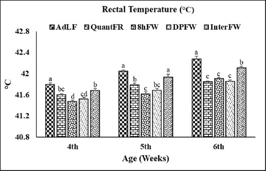 Figure 1 depicts the variations in rectal temperature of heat-stressed broilers subjected to different feeding management approaches at 4th, 5th, and 6th weeks of age. The AdLF group consistently exhibited the highest rectal temperature compared with the feed-restricted groups (p < 0.05). The lowest rectal temperature was recorded in the QuantFR, 8hFW, and DPFW groups during the 6th week of age.