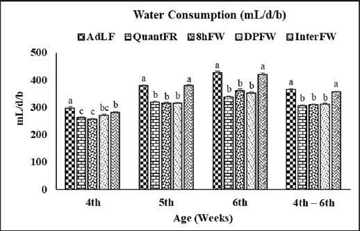 Fig. 2. Water consumption of experimental birds exposed to different feeding management approaches under HS conditions. a,b,cMeans assigned to different superscripts are significantly different (p < 0.05), where a, b, c means the highest, medium, and lowest mean, respectively. AdLF=ad libitum feeding; QuantFR=quantitative feed restriction; 8hFW=fixed-period feed withdrawal; DPFW=different periods of feed withdrawal; InterFW=intermittent feed withdrawal.