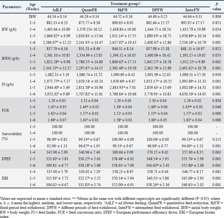 Methods: A total of 750 broiler day-old chicks were reared in an open-sided house for 6 weeks and allocated to five feeding approaches: T1=ad libitum feeding (AdLF); T2=quantitative feed restriction (6, 9, and 12% restrictions during the 4th, 5th, and 6th weeks, respectively, QuantFR); T3=fixed-period feed withdrawal (8 hours restriction, 8hFW); T4=different periods of feed withdrawal (5, 7, and 9 hours restrictions during the 4th, 5th, and 6th weeks, respectively, DPFW); and T5=intermittent feed withdrawal (2 hours of feeding and 2 hours of fasting, InterFW), with 5 replications of 30 chicks each. All groups were fed ad libitum for the first 3 weeks; thereafter, feed restriction protocols were applied. Data on growth, water intake, rectal temperature, serum biochemistry, carcass yields, meat quality, and gut histomorphology were analyzed.