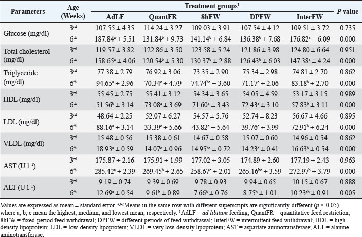 No significant variations appeared at the 3rd week of age; however, at the 6th week of age, different feeding management approaches significantly influenced serum biochemical indices (Table 4). The AdLF and InterFW groups demonstrated significantly (p < 0.05) elevated glucose levels, whereas the QuantFR, 8hFW, and DPFW groups showed reduced levels. Similarly, total cholesterol, triglycerides, LDL, and VLDL levels were significantly (p < 0.05) the highest in the AdLF group, followed by the InterFW group, and the lowest in the QuantFR, 8hFW, and DPFW groups. In contrast, HDL was significantly elevated in the QuantFR, 8hFW, and DPFW groups (p < 0.05). The liver enzyme levels were also influenced by the FR approaches, with ALT and AST levels being the highest in the AdLF, moderate in the InterFW, and lowest in the 8hFW, DPFW, and QuantFR groups (p < 0.05).