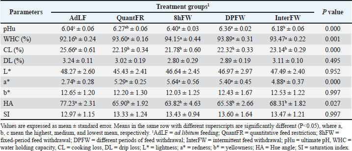 Table 6. Physicochemical properties of breast meat of experimental birds exposed to different feeding management approaches under HS conditions.