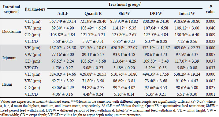 Table 7. Intestinal histomorphology of experimental birds exposed to different feeding management approaches under HS conditions.