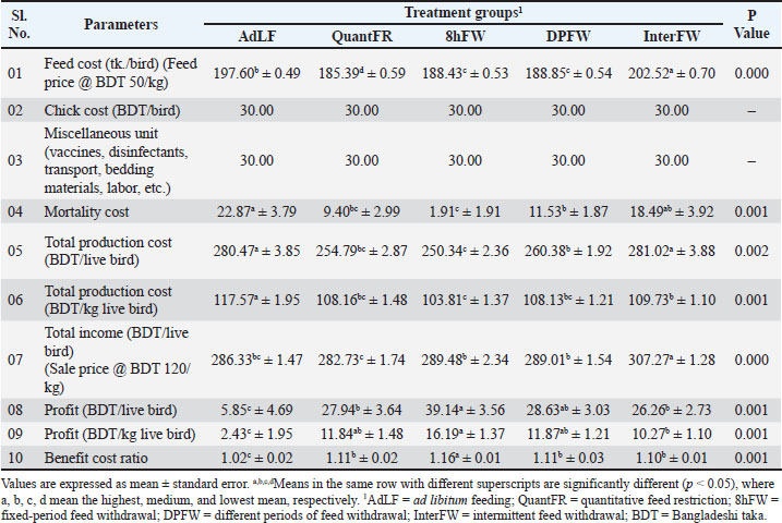 A comprehensive benefit-cost analysis was conducted, considering the expenses associated with the purchase of chicks, feed, equipment (feeders, drinkers), litter, disinfectants, vaccine, labor, and other necessary variables. The mortality cost was calculated by multiplying the total number of dead birds by the income per bird. The income per bird was determined by dividing the total income by the total number of birds. The total income was calculated using the average live weight of the birds and the selling price. Profits were computed by subtracting the total cost from the total revenue, and the benefit-cost ratio was derived by dividing the total revenue by the total cost.