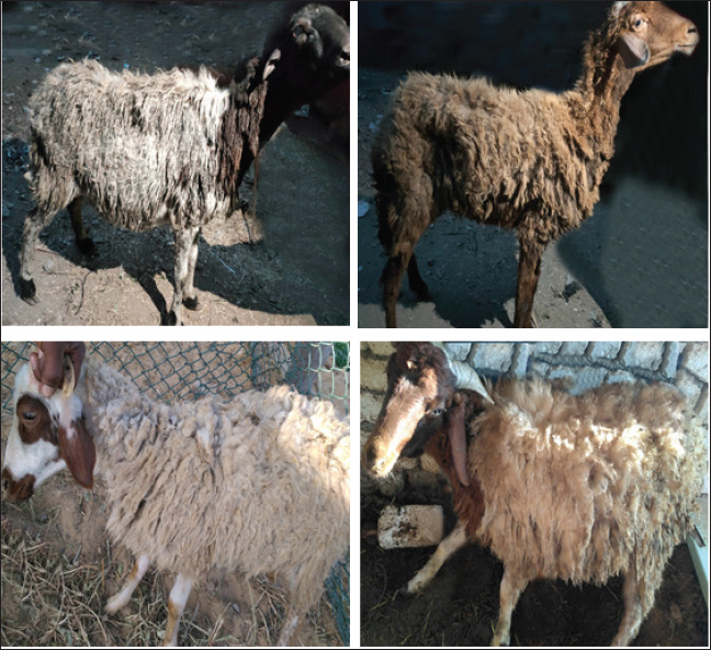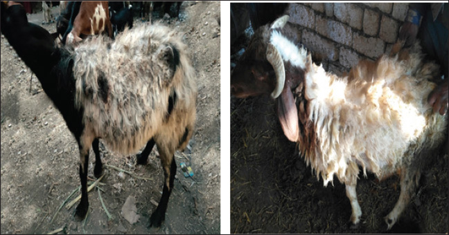 Fig. 4. Sheep suffering from diffused alopecia. Our study revealed that the mean body temperature, heart rate, respiration rate, and ruminal movement were 38.5ºC, 90/minutes, 30/minutes, and 1/2 minutes, respectively. Our results were in conformity with the data acquired by Sobiech and Kuleta (2002), who indicated that sheep showed normal appetite, whereas in our experiment, there was a decrease in sheep appetite. Because of anemia caused by a lack of Cu and iron, the mucous membrane was paler than usual. Although our investigation found negative interior and external parasites as well as a lack of Cu and iron, pale mucous membranes, and anemia severity are linked to gastrointestinal nematodes. Alopecia, parakeratosis, alterations in the coat (steely wool), a minor decrease in appetite, a drop in body weight gain, locomotor disruption, and anxious symptoms were among the other clinical indicators displayed by the afflicted sheep. Similar findings have been documented in other related studies (Abd El-Raof and Ghanem, 2006; Aitken, 2008).
