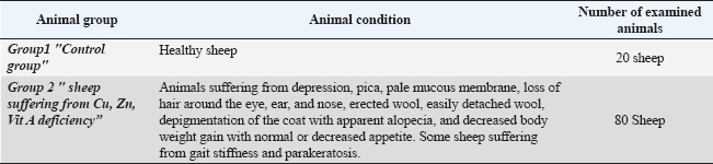 ABSTRACTBackground: A number of elements are essential for the body, including zinc (Zn), copper (Cu), vitamin A, and vitamin E. Nutritional deficiency diseases (ND diseases) are ailments that reduce the amount of animals produced, restrict commerce, and can result in severe economic losses. Mineral deficiencies, whether primary or secondary, create significant obstacles in livestock production because they are associated with decreased productivity, reproductive issues, and various health complications. Aim: This study aimed to determine the levels of Zn, Cu, and vitamin A, as well as the clinical signs, hematological, biochemical, and antioxidant changes that may occur due to the nutritional deficiencies of such trace elements and vitamin A in sheep. Methods: Several blood parameters were measured in normal or nutritionally deficient sheep. Such parameters included hematological levels, glucose, total protein, albumin, globulin, and oxidative stress GSH-Px, SOD, and CAT. This study was conducted on 100 sheep (male and female). Eighty sheep suffered from Zn, Cu, and vitamin A deficiency, and 20 were clinically healthy and served as the control group. Results: The diseased animals had the following clinical signs: depression, pica, pale mucous membrane, loss of hair around the eye, ear, and nose, erected wool, easily detached wool, depigmentation of the coat with apparent alopecia, decreased body weight gain with normal or decreased appetite. Some sheep were suffering from gait stiffness and parakeratosis with a marked increase in heart and respiratory rates, with normal body temperature. The obtained results showed significant decreases (p < 0.05) in Hb, PCV, RBCs, and WBCs in addition to significant decreases (p < 0.05) in glucose and total protein. Significant decreases in the levels of antioxidant enzymes (GSH-Px, CAT, and SOD) were also recorded. Conclusion: These results indicate that nutritional deficiencies of the trace elements Zn, Cu, and vitamin A make sheep liable to several skin disorders. Therefore, dietary supplementation of such macro and micro-elements is highly recommended to avoid such adverse effects. Keywords: Nutritional deficiencies, Zinc, Copper, Vitamin A, Skin disorders, Sheep. IntroductionSheep are responsible for 40% of cash income and 19% of household meat consumption. The most common sheep breeds in Egypt are the Rahmani, Ossimi, and Barki varieties, which account for approximately 65% of the livestock population in Egypt. According to Tefera (2004), they play a significant role in the production of wool, which is used in the leather industry and the production of meat. The skin performs several functions, including acting as an enclosing barrier, providing protection from the environment, regulating temperature, producing pigment and vitamin D, and providing sensory perception. The skin is the largest and heaviest single organ in the body, accounting for 12%–24% of an animal’s total body weight. The skin is much more than just an outer covering. According to van Beeck et al. (2015), its purpose is to keep the body in a state of homeostasis despite the daily assaults that come from the outside. Protein, vitamin A, vitamin E, essential fatty acids (EFAs), zinc (Zn), and copper (Cu) are some of the nutrients that can affect the skin and hair coat health of an animal. The coat of an animal is a reflection of its overall health and nutrition (Postnov et al., 2022). Any factor that affects the body has a direct effect on wool production, such as any systemic disease, stress, or nutritional deficiency that leads to wool weakening and fiber thinning, which causes wool breakage at any weak point. Skin diseases have a significant impact on the efficiency and quality of sheep wool production, which is an essential product for the sheep industry (Scott, 2015). Skin diseases resulting from different causes mostly present with a similar clinical appearance. The veterinarian must use a systemic approach to successfully detect skin problems and arrive at an accurate diagnosis by obtaining a complete history, performing a thorough physical examination, and using one or more simple diagnostic techniques (Carmalt et al., 2004). Infectious causes include parasitic causes (lice and mange), fungal infestation (ringworm), and viral infection (papillomatosis, lumpy skin disease, and contagious pustular dermatitis) (Prohic et al., 2022). According to Kusiluka et al. (1996), skin destruction caused by all infectious agents, including external parasites, fungi, bacteria, and viruses, results in a loss of mechanical protection between the animal and its environment. In turn, this makes it easier for other diseases to infiltrate the animal, which can have a negative impact on the animal’s overall health. Additionally, nutritional deficiencies, such as Cu, Zn, and vitamin A, can affect the skin and wool of animals. The proportions of various components, including proteins, lipids, minerals, and vitamins, affect the structure of wool. According to Ambilo and Melaku (2013), wool quality is indicated by its fiber diameter, yield, crimp, color, and strength. Any disruption in these nutrients can affect the skin’s barrier function and immune protection. Clinical signs of nutritional deficiencies in animals include diarrhea, anemia, alopecia, depigmentation, seborrhea, hyperkeratosis, parakeratosis, anorexia, fertility problems, development problems in young animals, decreased production, tetany, decreased protein synthesis, immune system insufficiencies, and pica (Antoniou et al., 2022). The term “Cu deficiency” refers to a condition in which the body is unable to absorb Cu in the digestive tract for a variety of reasons, the most important of which is the interplay between Cu, molybdenum, and sulfur. Copper thiomolybdate (CuMoS4) is formed when these three elements bind to each other, which prevents Cu from being absorbed and leads to the subsequent problem. In addition, its def
